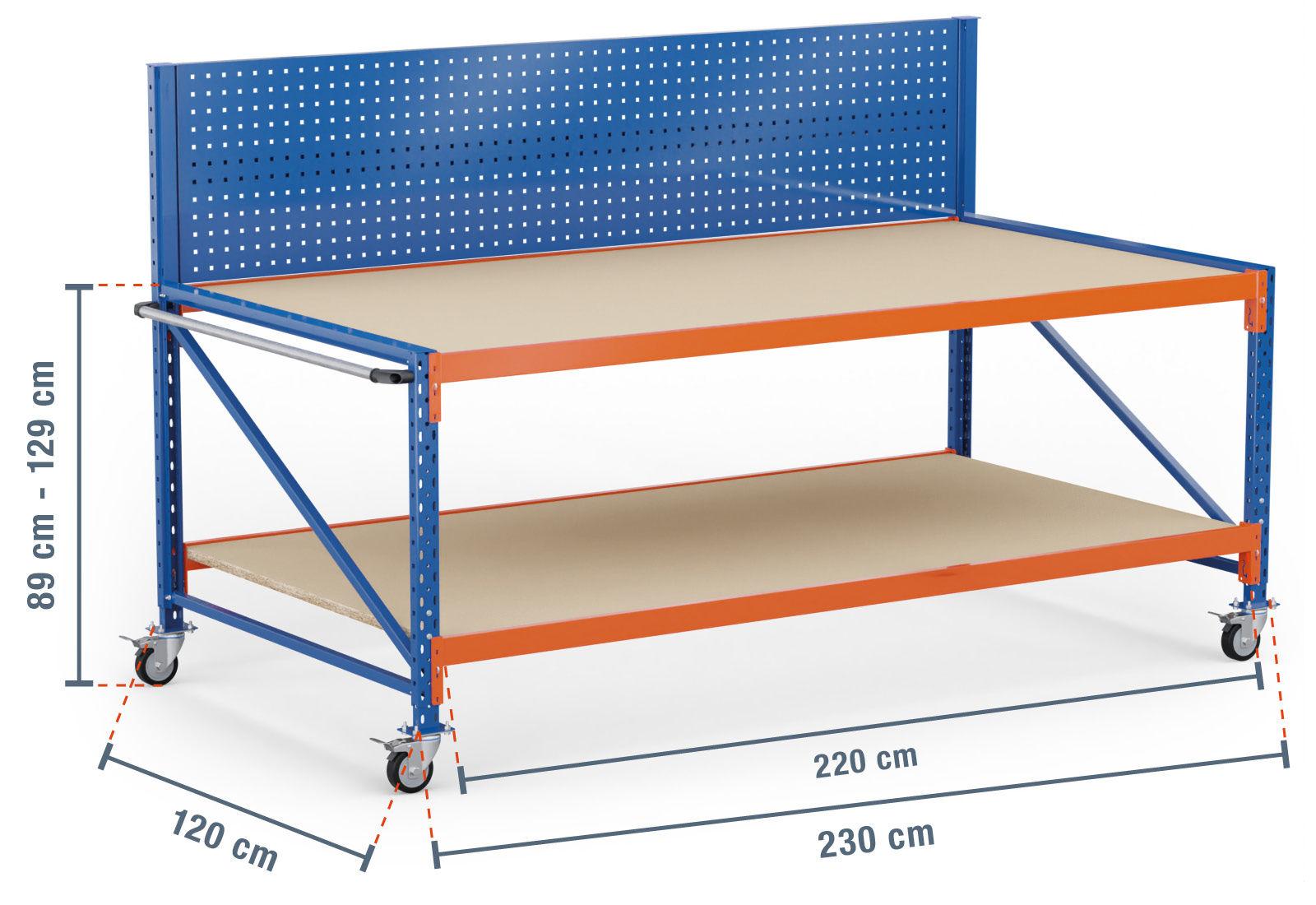 2,3 m mobile worktable MFW1000-ATF / 120 cm deep / 890 - 1.290 mm high / 2 levels / rack layer Wood / perforated rear panel