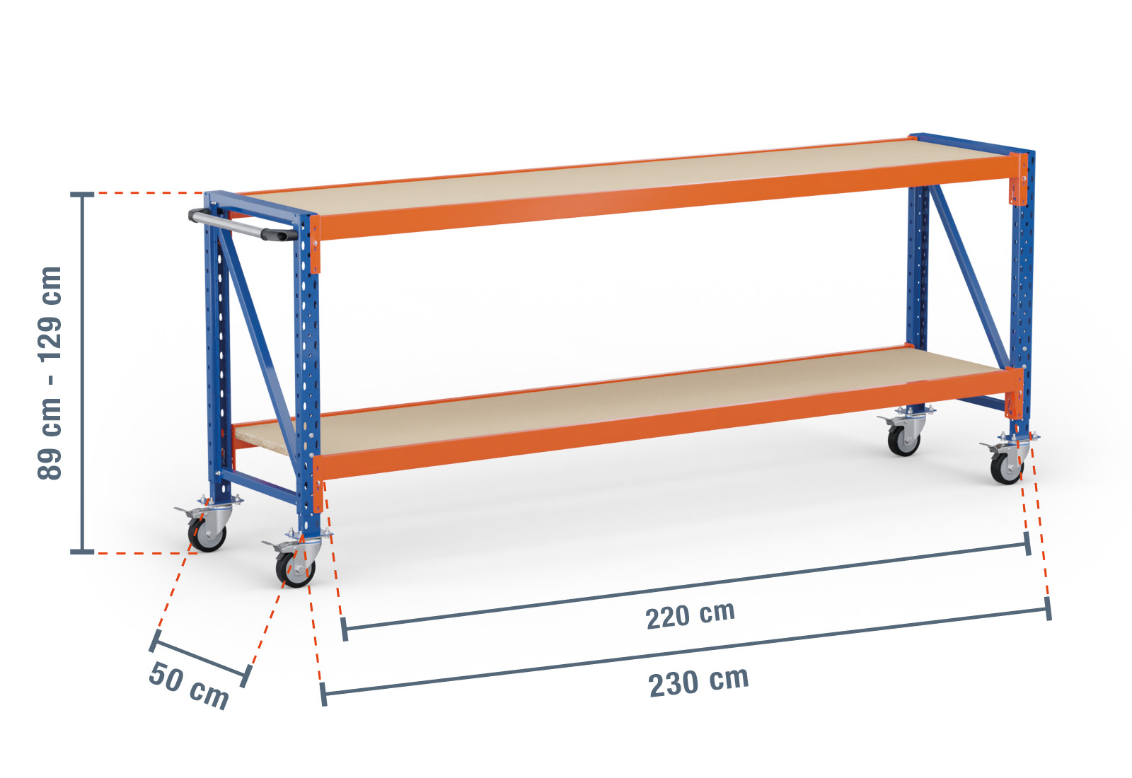 2,3 m Mobile worktable MFW1000-ATF / 50 cm deep / 890 - 1.290 mm high / 2 levels / rack layer Wood