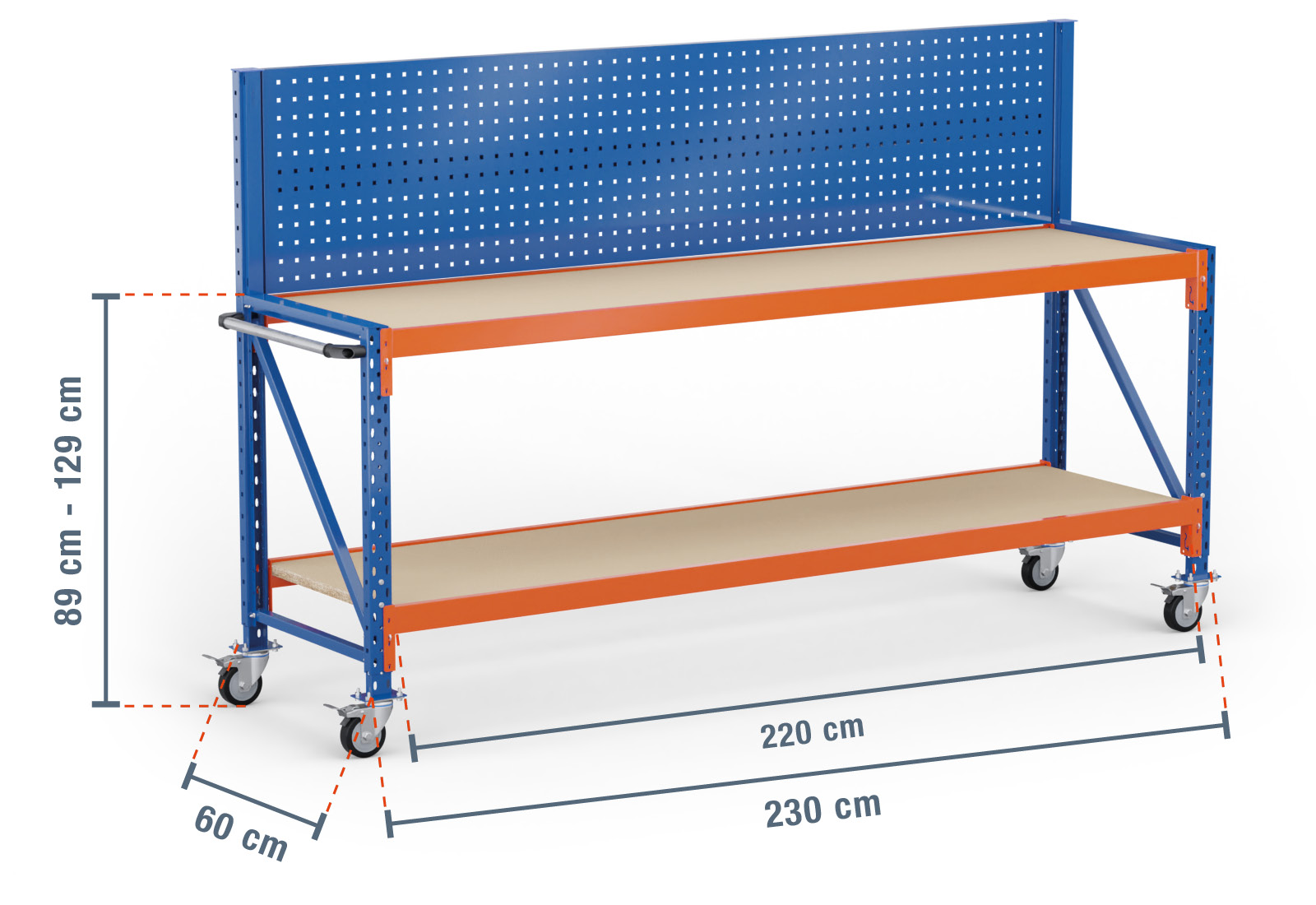 2,3 m mobile worktable MFW1000-ATF / 60 cm deep / 890 - 1.290 mm high / 2 levels / rack layer Wood / perforated rear panel