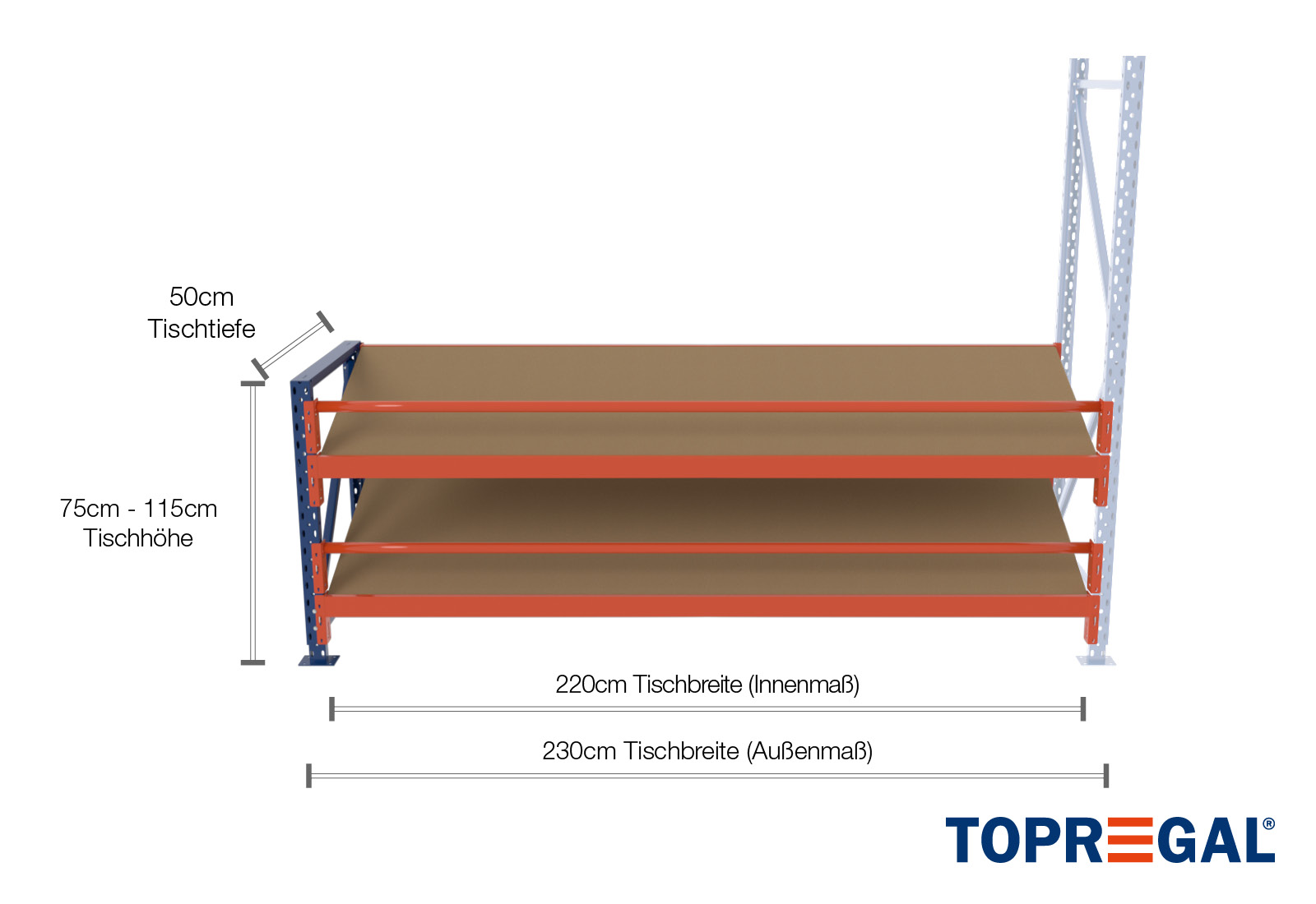2,3 m worktable storage rack / extension table 750 - 1.150 mm table height / 50 cm deep with 2 levels incl. kanban shelves