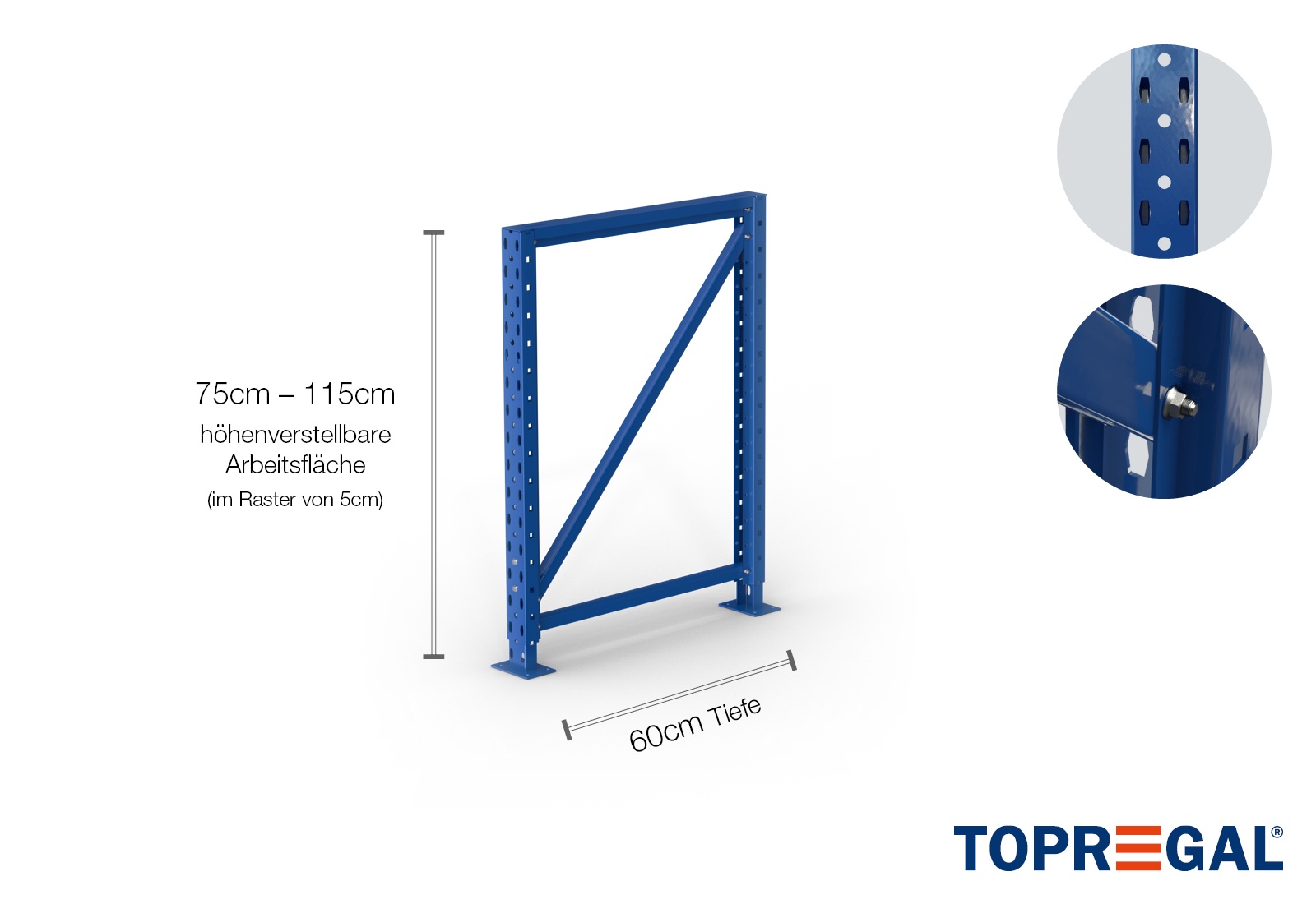 - Complete packing-table storage rack upright incl. foot parts and struts, height adjustable from 75–115cm, 60cm deep