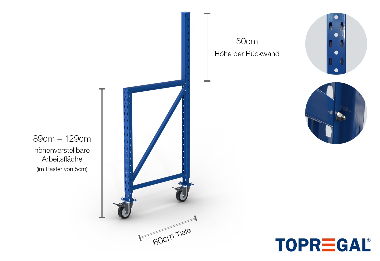 Packing-table storage rack upright 89–129cm height-adjustable / 60cm deep with castors (for perforated back panel)