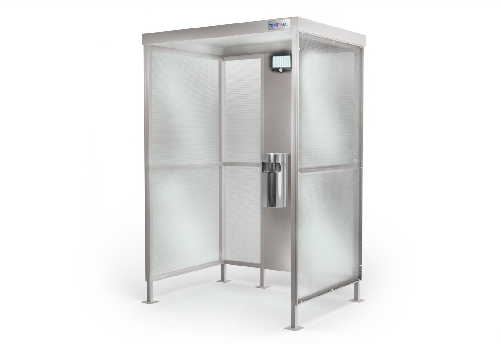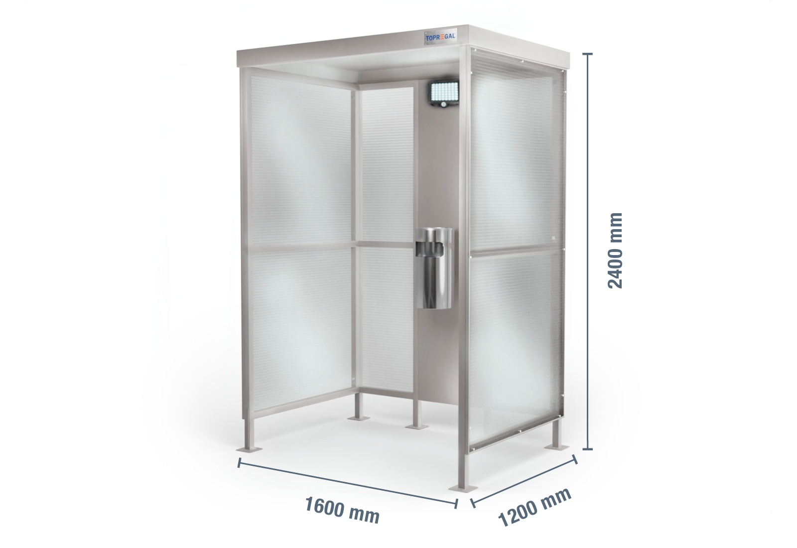 Petit abri fumeurs US1600/3, 1.600 mm x 1.200 mm x 2.400 mm, y compris lampe solaire à LED SLB800 et poubelle avec cendrier