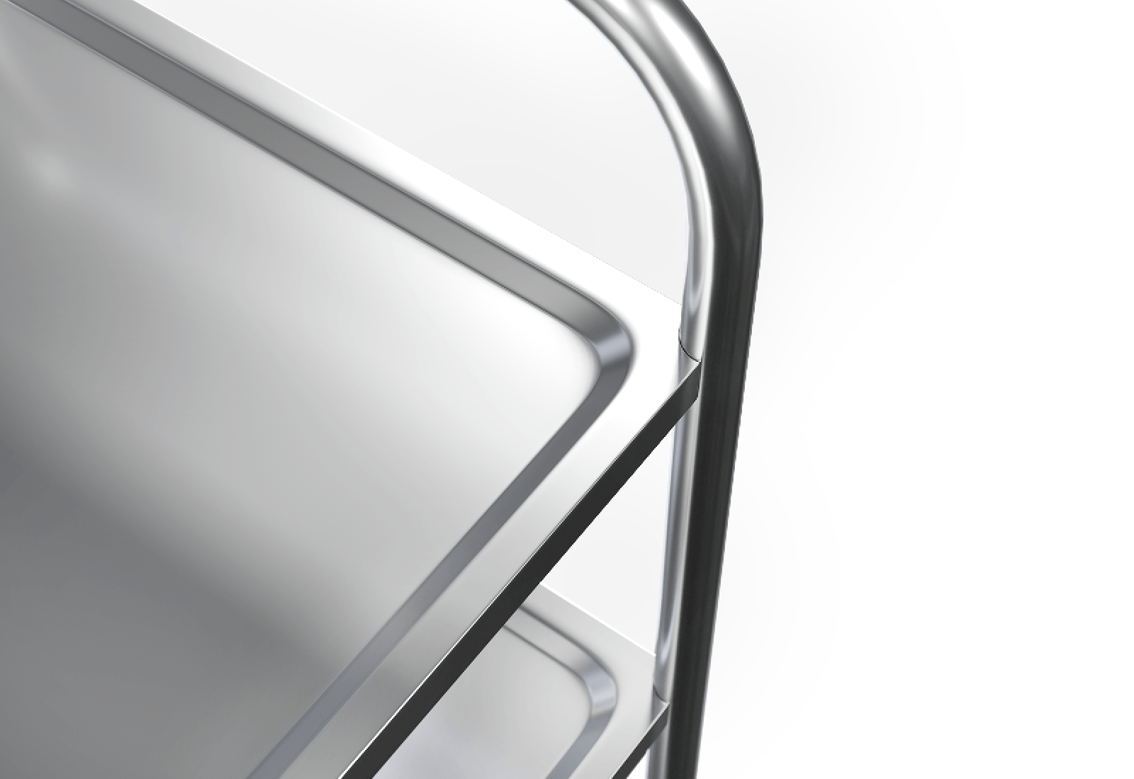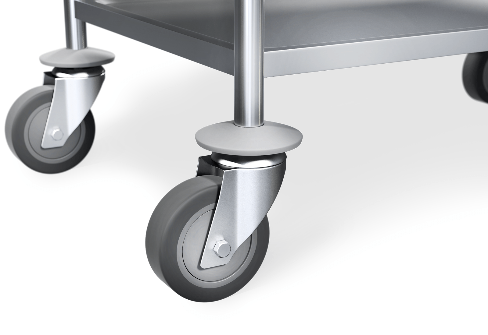 Les 4 roues pivotantes TPR à roulement à billes confèrent au chariot sa maniabilité doublée du confort et du faible niveau sonore de ses déplacements. 2 roues sont équipées de freins de blocage qui renforcent la sécurité des chargements et déchargements. Les pare-chocs en caoutchouc sur les quatre roues évitent d’endommager les objets environnants, tels que les murs et les pieds de table, dans l’effervescence du travail quotidien. Les arceaux en tube rond sur les côtés courts permettent de déplacer commodément le chariot à étagères, même à pleine charge (jusqu’à 100 kg).