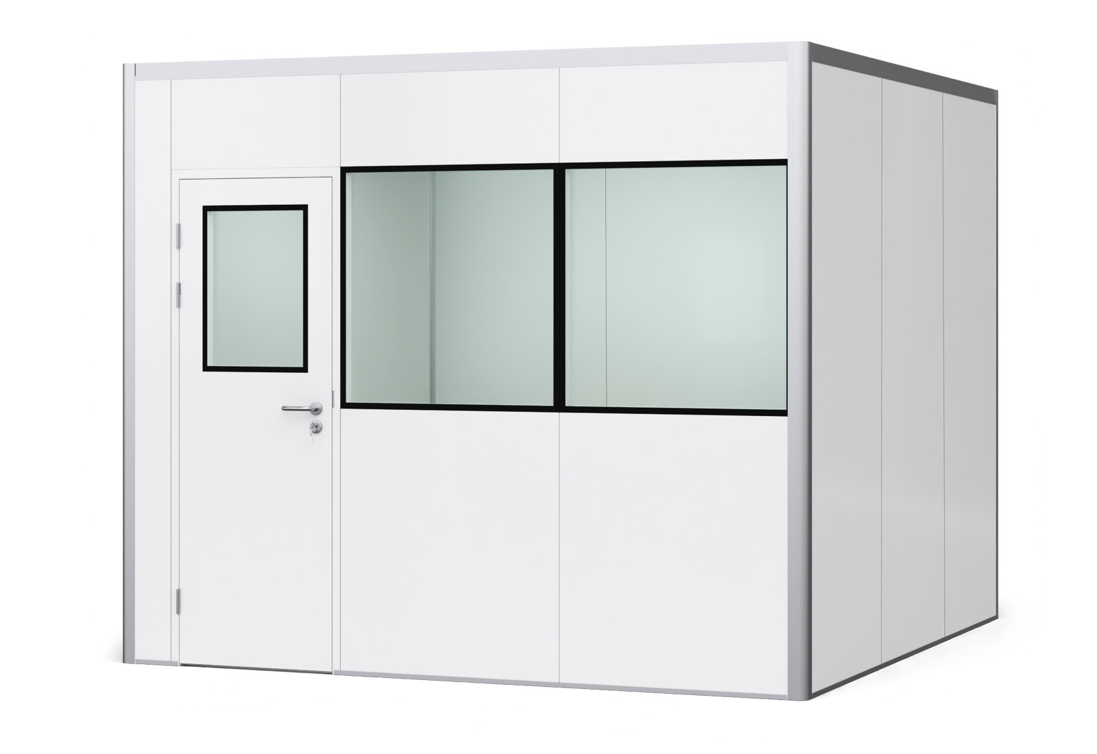 La hauteur (2.500 mm dimension intérieure | 2.550 mm dimension extérieure) et la profondeur de la pièce (3.000 mm dimension intérieure | 3.100 mm dimension extérieure) restent toujours les mêmes. Le matériau des panneaux, construit en sandwich, se compose à l'extérieur et à l'intérieur d'acier (blanc, laqué au pistolet, 0,4 mm d'acier) et au milieu de laine de roche comme couche d'isolation. Ainsi, les panneaux ne sont certes pas très légers (11 kg/m2), mais ils sont très stables et peu de bruits provenant de l'environnement souvent bruyant du hall pénètrent dans le système "pièce dans la pièce". La valeur d'isolation se situe entre 20 - 40 dB selon le volume sonore extérieur. La valeur d'isolation thermique des bureaux de hall PREFAB est de 0,787 W/(m²K) et la conductivité thermique de 0,05 W/(mK).INFO : Le toit n'est pas accessible ou ne peut pas être chargé.
