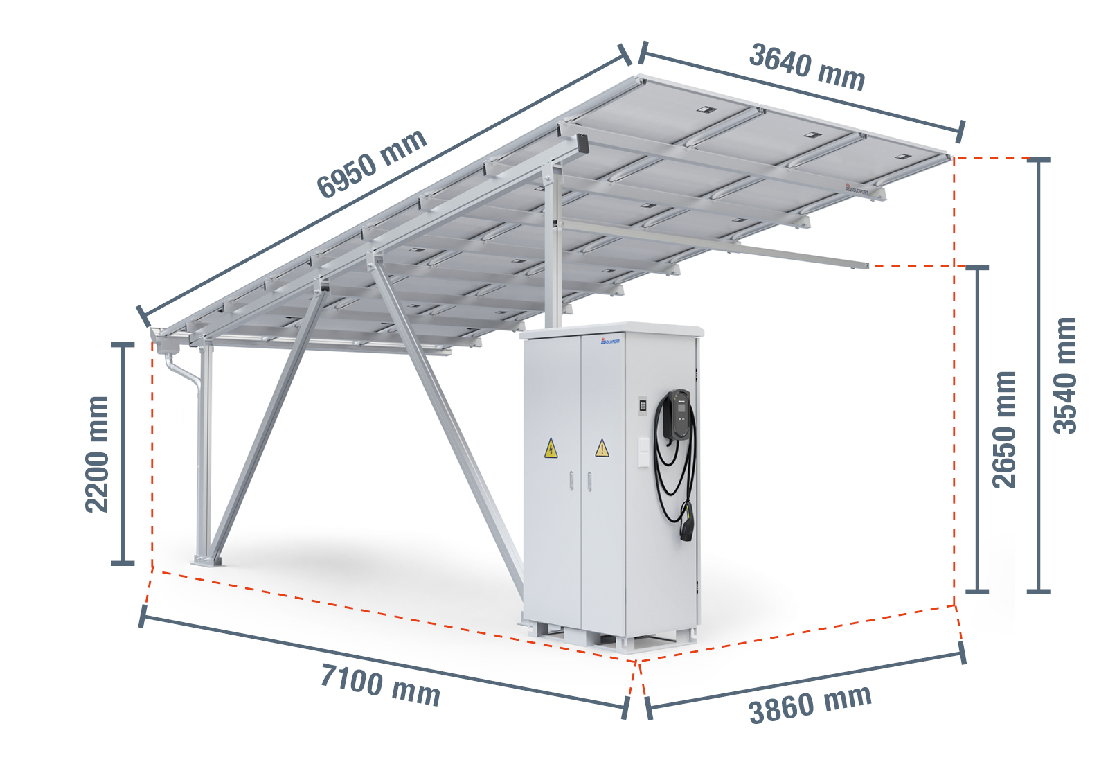 Carport solaire annexe SP40/5-1A avec Wallbox, armoire électrique et gouttière, Aluminium, hauteur de passage 2.200 mm, SoloPort