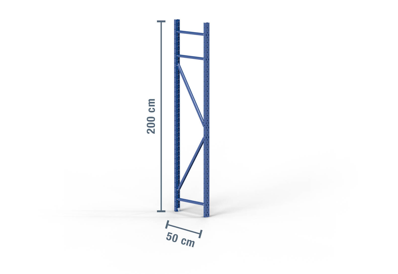 Montant pour rack de stockage en acier laminé à froid d’une hauteur de 2 m et d’une profondeur de 50 cm. La charge d’unité (charge max. entre deux montants de rack de stockage) s’élève à 2.000 kg. Le thermolaquage bleu protège le montant de rack contre la corrosion. Il est solidement fixé au sol à l’aide de boulons d’ancrage M8 x 55 mm, ce qui assure la stabilité de l’ensemble du rack de stockage.