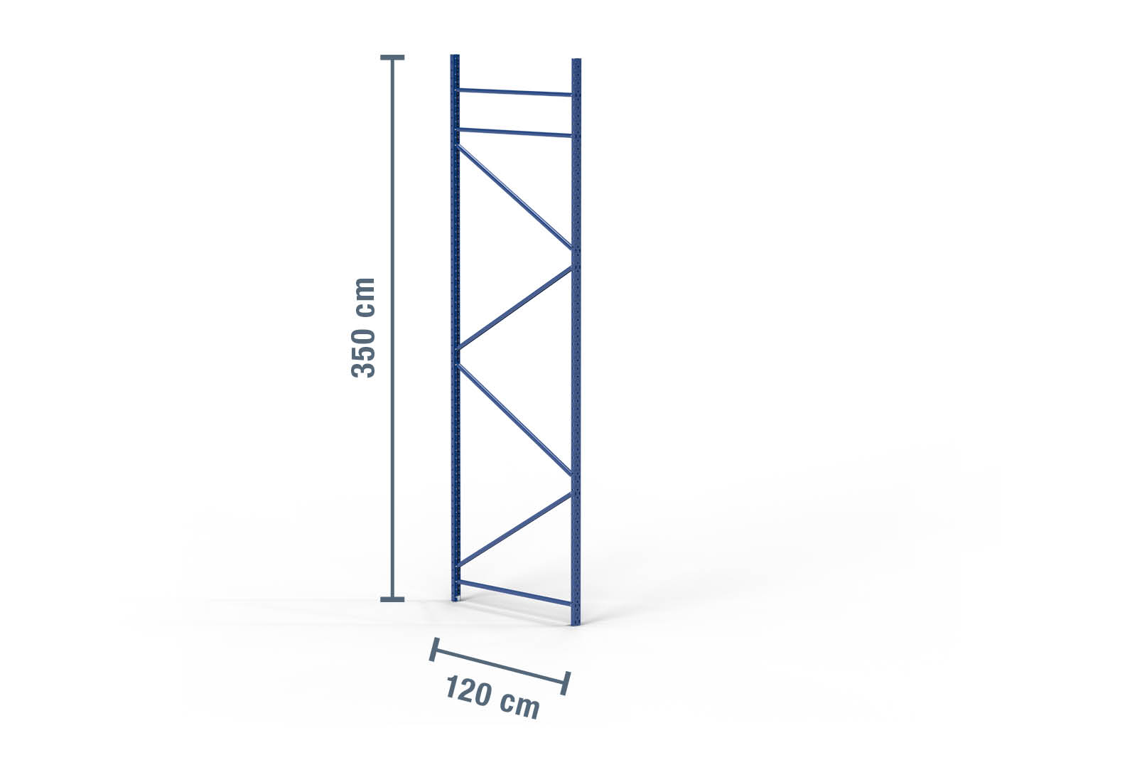 Montant pour rack de stockage en acier laminé à froid d’une hauteur de 3,5 m et d’une profondeur de 120 cm. La charge d’unité (charge max. entre deux montants de rack de stockage) s’élève à 2.000 kg. Le thermolaquage bleu protège le montant de rack contre la corrosion. Il est solidement fixé au sol à l’aide de boulons d’ancrage M8 x 55 mm, ce qui assure la stabilité de l’ensemble du rack de stockage.