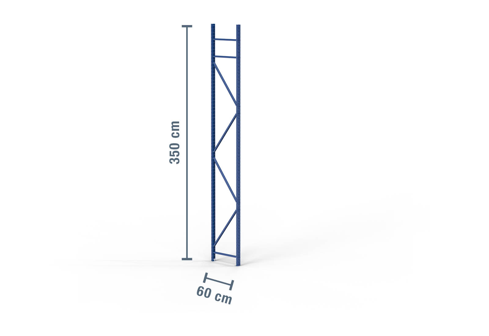 Montant pour rack de stockage en acier laminé à froid d’une hauteur de 3,5 m et d’une profondeur de 60 cm. La charge d’unité (charge max. entre deux montants de rack de stockage) s’élève à 2.000 kg. Le thermolaquage bleu protège le montant de rack contre la corrosion. Il est solidement fixé au sol à l’aide de boulons d’ancrage M8 x 55 mm, ce qui assure la stabilité de l’ensemble du rack de stockage.