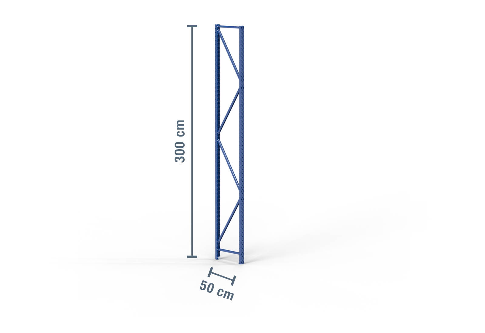Montant pour rack de stockage en acier laminé à froid d’une hauteur de 3 m et d’une profondeur de 50 cm. La charge d’unité (charge max. entre deux montants de rack de stockage) s’élève à 2.000 kg. Le thermolaquage bleu protège le montant de rack contre la corrosion. Il est solidement fixé au sol à l’aide de boulons d’ancrage M8 x 55 mm, ce qui assure la stabilité de l’ensemble du rack de stockage.