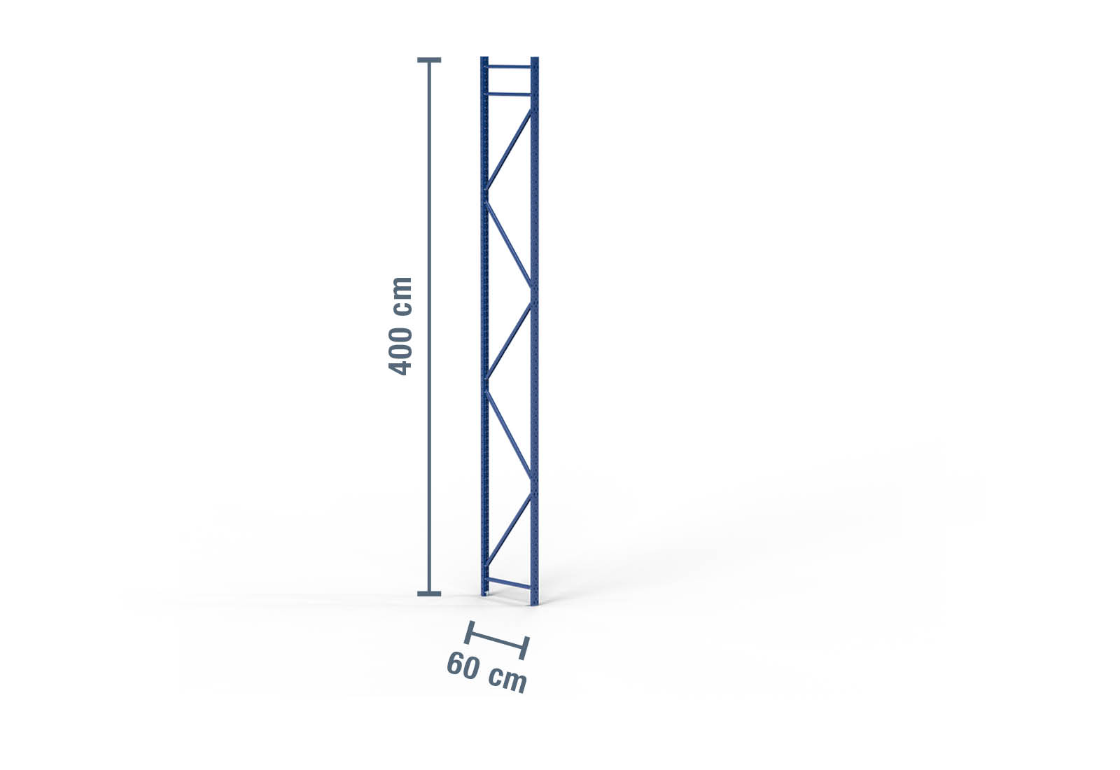 Montant pour rack de stockage en acier laminé à froid d’une hauteur de 4 m et d’une profondeur de 60 cm. La charge d’unité (charge max. entre deux montants de rack de stockage) s’élève à 2.000 kg. Le thermolaquage bleu protège le montant de rack contre la corrosion. Il est solidement fixé au sol à l’aide de boulons d’ancrage M8 x 55 mm, ce qui assure la stabilité de l’ensemble du rack de stockage.