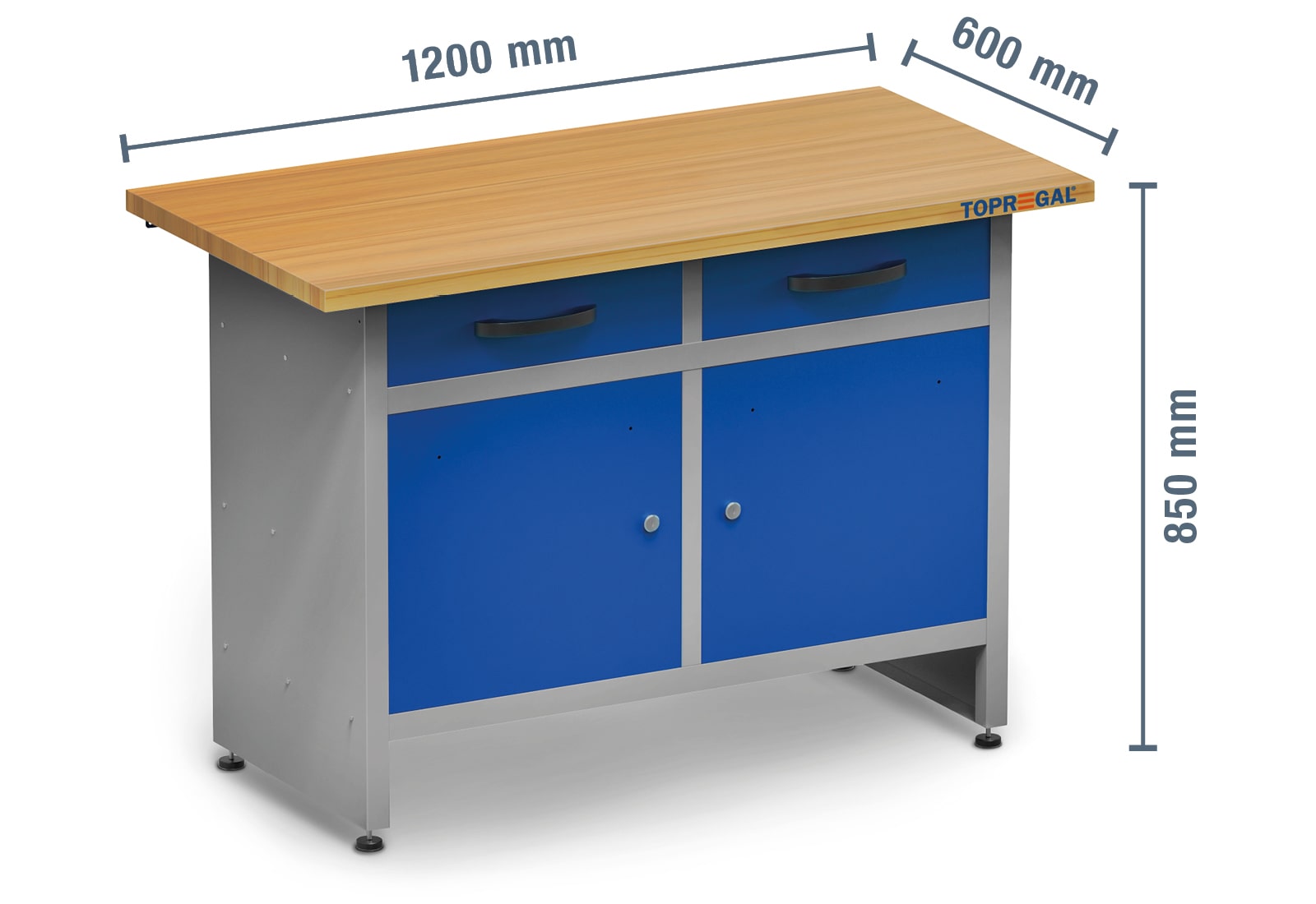 Les portes et les tiroirs sont en acier à revêtement par poudre de couleur RAL5005 (bleu). La charge maximale des tiroirs est de 20 kg. Le plan de travail 30 mm est en bois robuste.