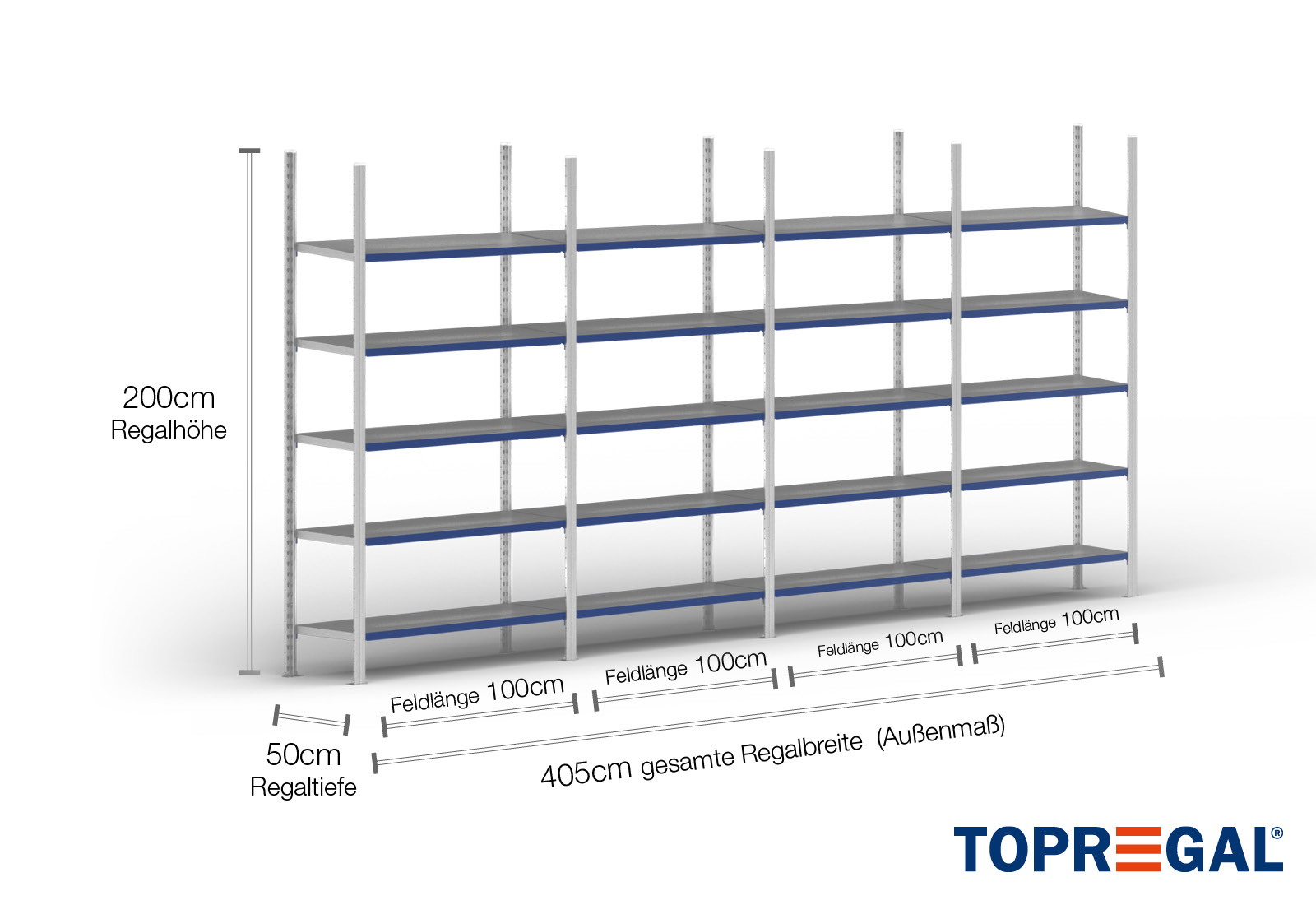 4 m rayonnage métallique FB200 / profondeur 50 cm / hauteur 2 m / 5 niveaux / platelage Acier / charge de tablette 200 kg