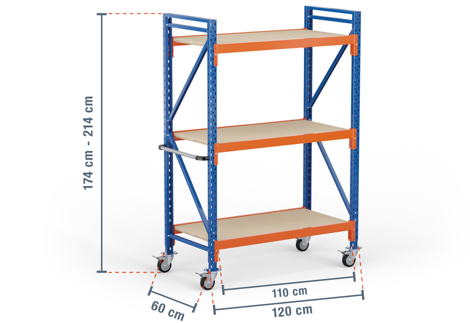 1,2 m rack de stockage mobile LR2000 / profondeur 60 cm / hauteur 1.740 - 2.140 mm / 3 niveaux / platelage Bois