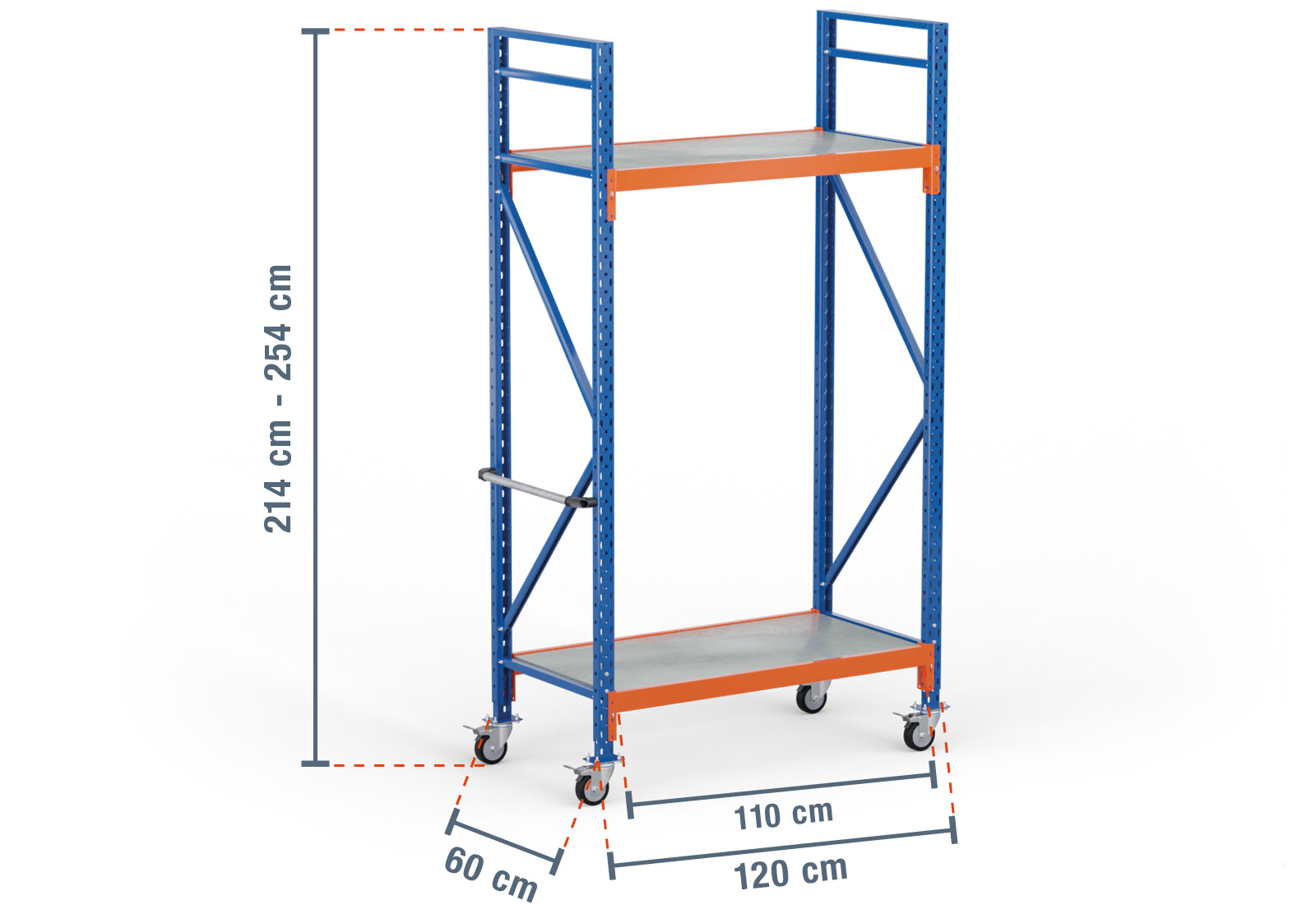 1,2 m rack de stockage mobile LR2000 / profondeur 60 cm / hauteur 2.140 - 2.540 mm / 2 niveaux / platelage Acier