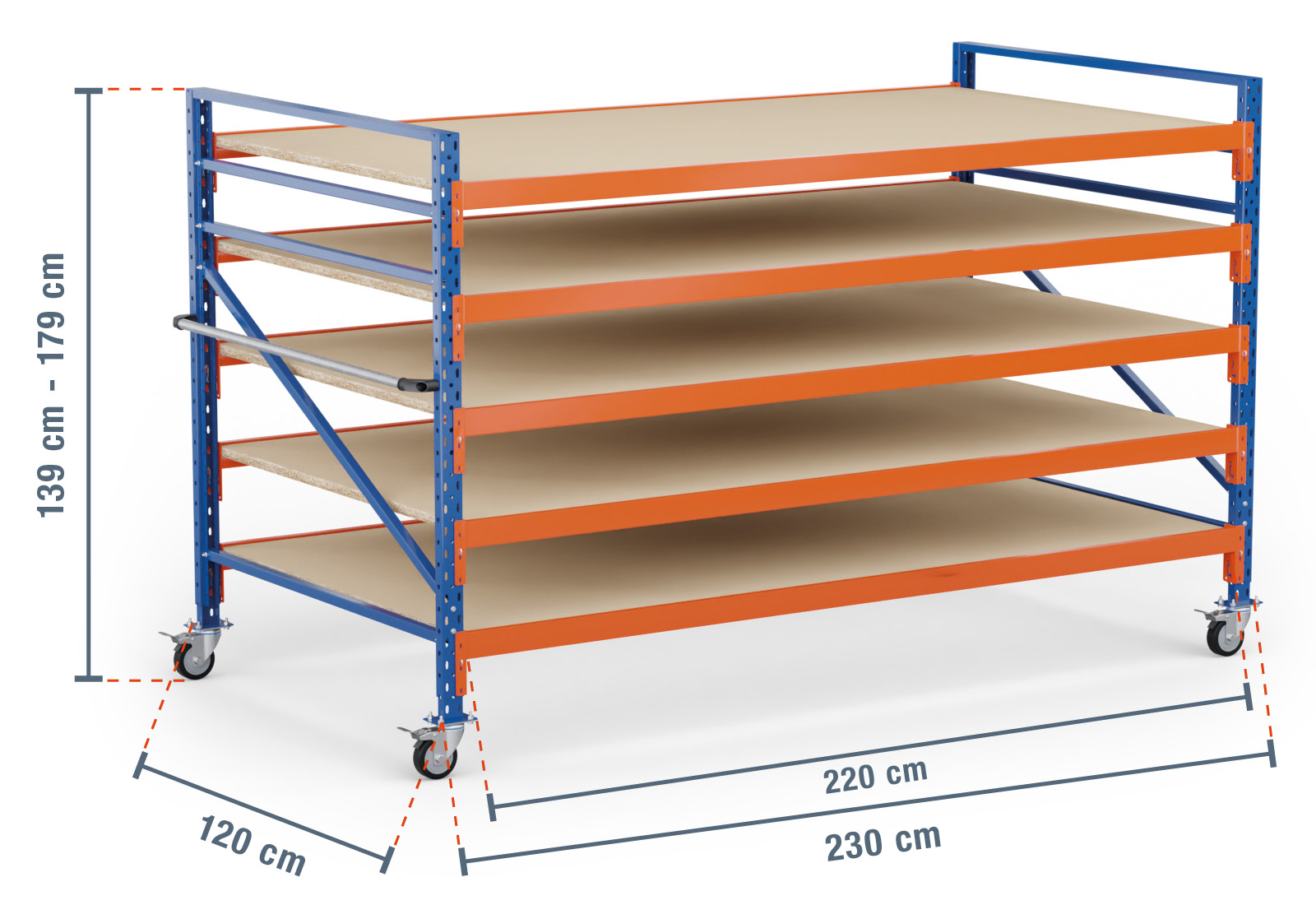 2,3 m rack de stockage mobile LR2000 / profondeur 120 cm / hauteur 1.390 - 1.790 mm / 5 niveaux / platelage Bois