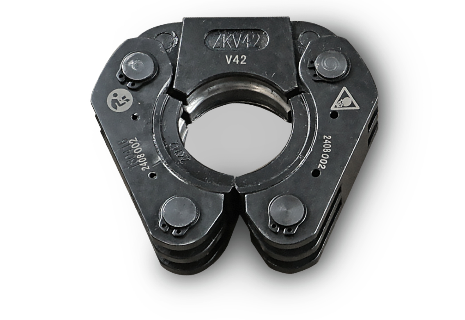 Pour la RPM32 Les mâchoires à sertir sont disponibles en différentes tailles. Les tailles disponibles sont V15, V18, V22, V28, V35, V42 et V54. Les deux plus grandes mâchoires de pressage V42 et V54 nécessitent en outre un adaptateur pour leur utilisation, qui doit être commandé avec la machine.