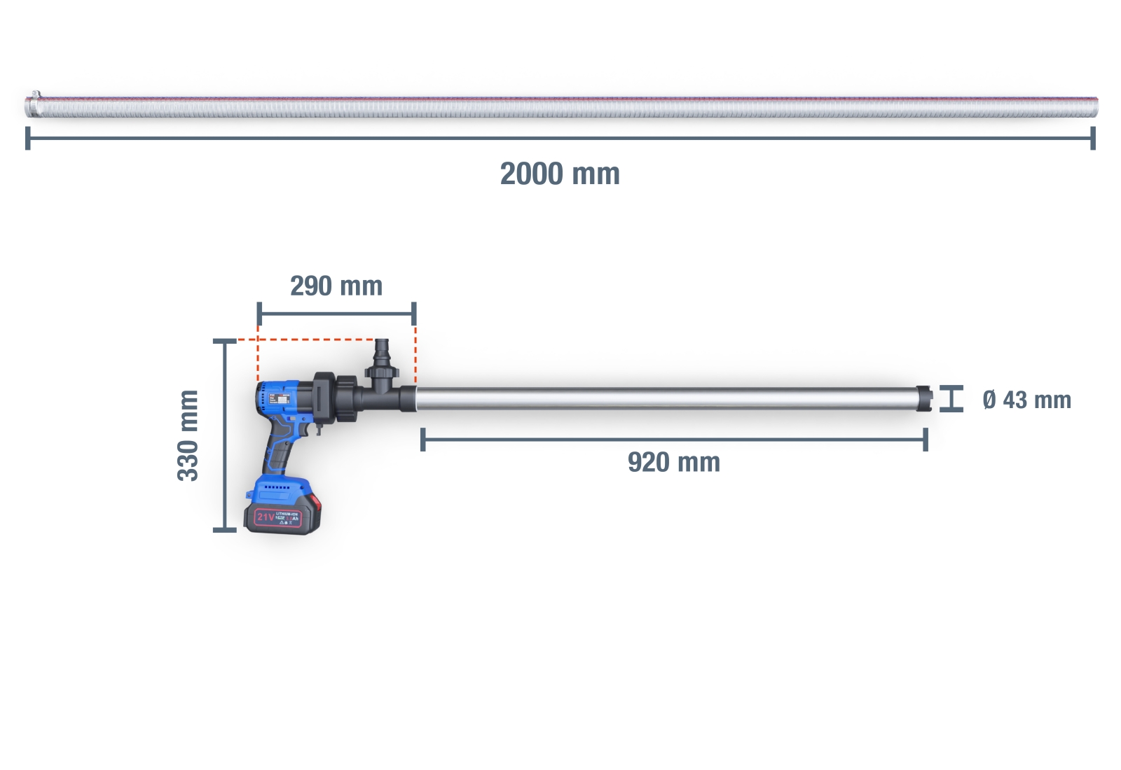 Les dimensions compactes (90 mm x 1.180 mm x 290 mm) de la pompe à huile électrique permettent un transport aisé. En combinaison avec le faible poids de 3,3 kg et la forme ergonomique de la poignée, la pompe vide-fût pratique est facile à manipuler. Le long tube d'aspiration en aluminium 920 mm (diamètre 43 mm), qui assure un centre de gravité agréable près de la poignée, y contribue également. Cela permet de soulever facilement l'appareil et de le guider vers un récipient. Le bouton de blocage situé sur la poignée offre un confort supplémentaire, car il n'est pas nécessaire de tenir la gâchette de la pompe en permanence. Le tuyau en PVC renforcé par des fils d'acier fourni est très flexible et se fixe facilement sur le raccord de tuyau de diamètre 25 mm De diamètre. Le long tuyau 2.000 mm vous permet de décider où le liquide pompé doit être dirigé.