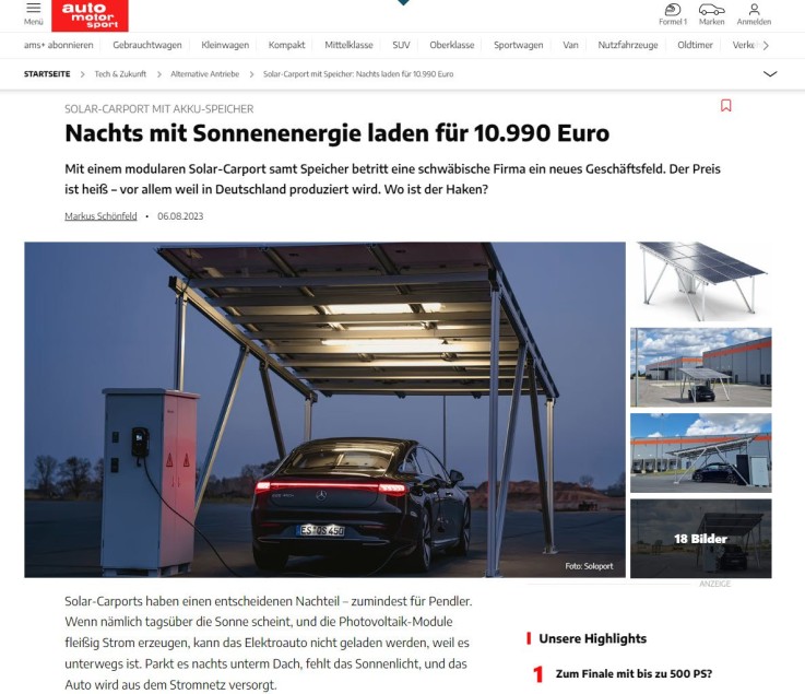 Le 06.08.2023, le magazine auto motor und sport a publié l'article "Recharger la nuit avec l'énergie solaire pour 10.990 euros", qui a pour thème nos abris de voiture solaires SoloPort.