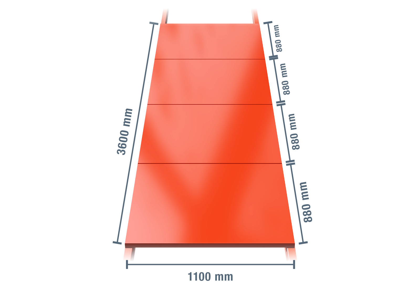 Le platelage acier pour rack à palettes se compose de 4 modules d’une profondeur de 1.100 mm et d’une largeur de 885 mm. Il atteint ainsi une dimension totale de 3.600 mm en largeur. Chaque module supporte une charge maximale de 1.000 kg.