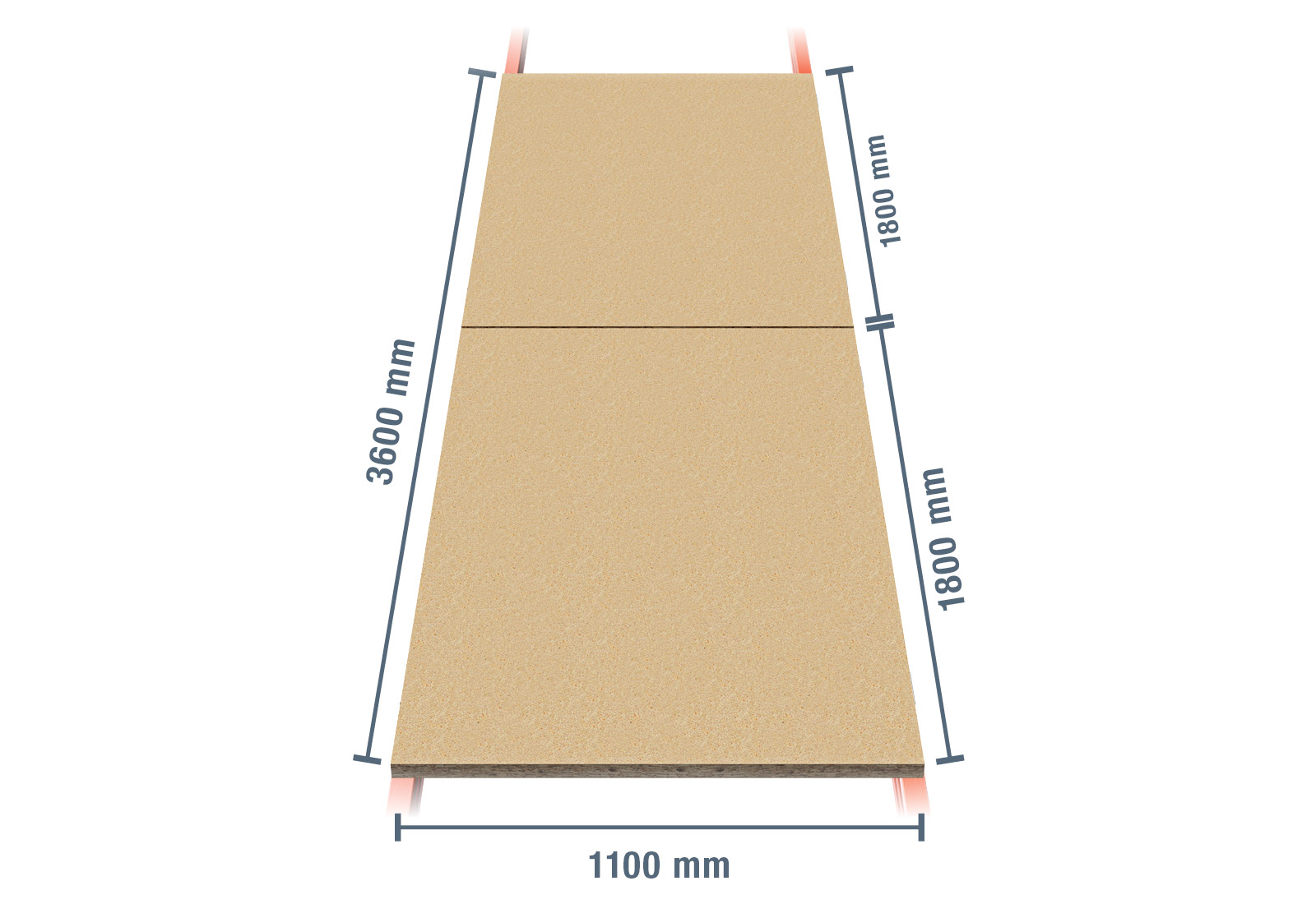 - 1 x 3.600 mm platelage en bois pour rack à palettes PR9000 / profondeur 1.100 mm / épaisseur 38 mm / 2 x traverse intermédiaire (composé de 2 modules de 180 cm)