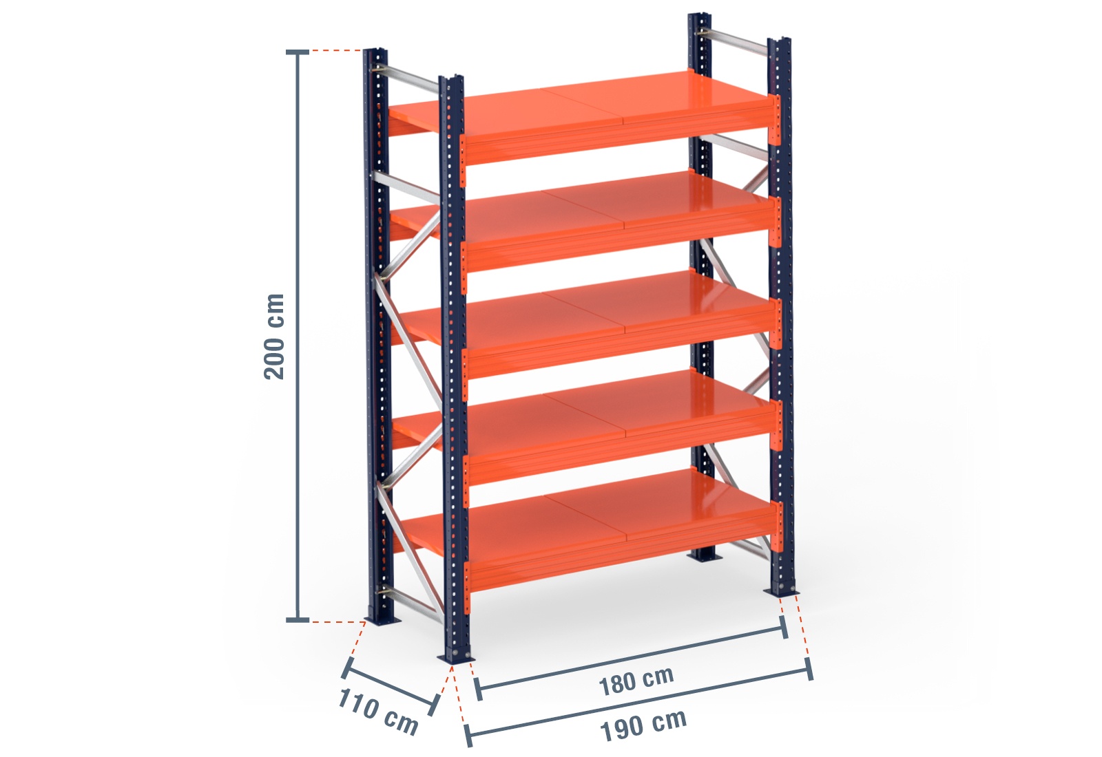 Les traverses sont thermolaquées en orange vif pour assurer la sécurité au travail. Elles s’accrochent simplement par enfichage dans les montants de rack. Des goupilles de sécurité supplémentaires protègent la traverse contre un retrait accidentel et assurent ainsi la sécurité. Les montants de rack à palettes se composent de deux profilés de montant thermolaqués en bleu. Les profilés de montant avant et arrière sont vissés ensemble à l’aide d’entretoises transversales et diagonales, ce qui permet une excellente stabilité. Afin de la garantir encore davantage, 2 socles sont montés aux extrémités inférieures de chaque montant de rack et ancrés solidement au sol à l’aide de boulons d’ancrage . Ainsi, notre rack à palettes modulaire est non seulement personnalisable, mais aussi particulièrement fiable grâce à sa fixation dans le sol.