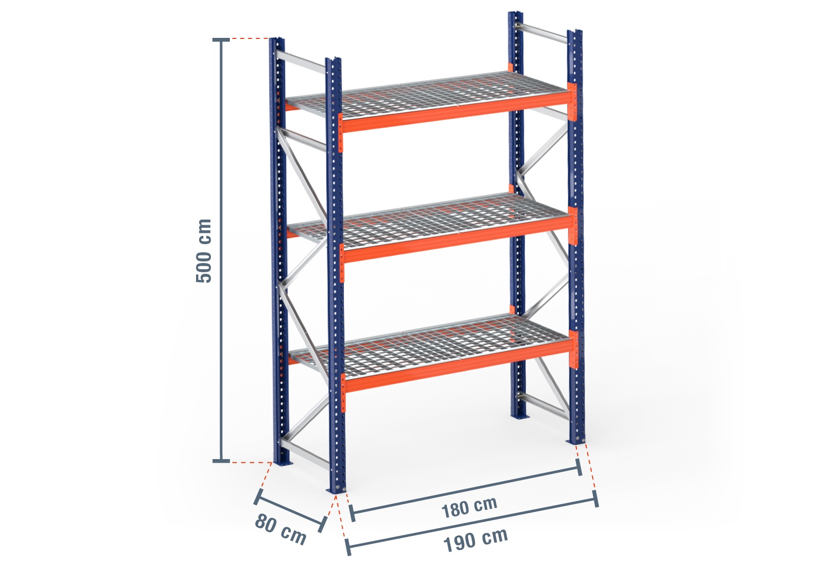 1,9 m rayonnage à palettes PR9000 / profondeur 80 cm / hauteur 5 m / 3 niveaux / platelage Grillage