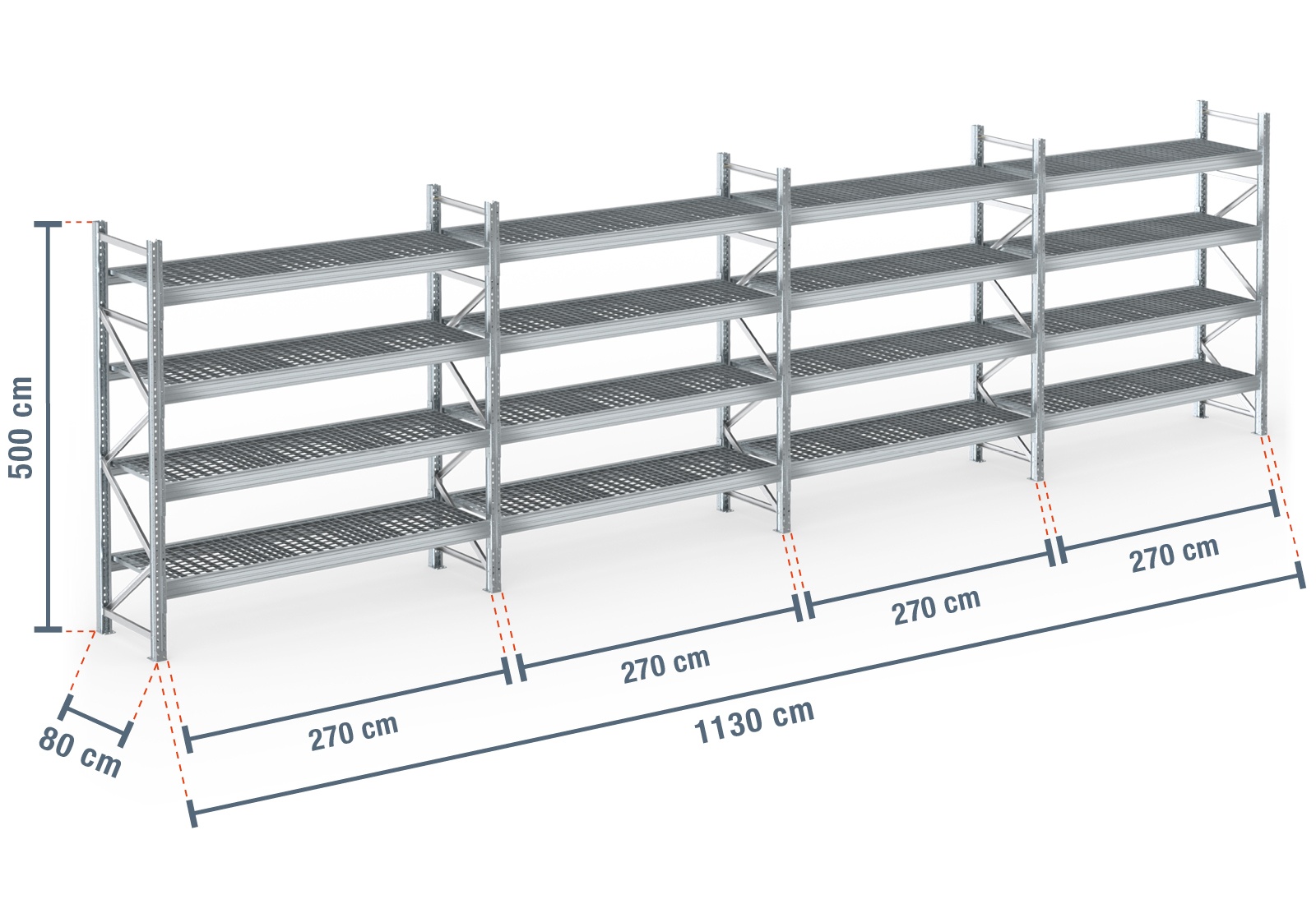 11,3 m rayonnage à palettes PR9000F galvanisé / profondeur 80 cm / hauteur 5 m / 4 niveaux / platelage Grillage