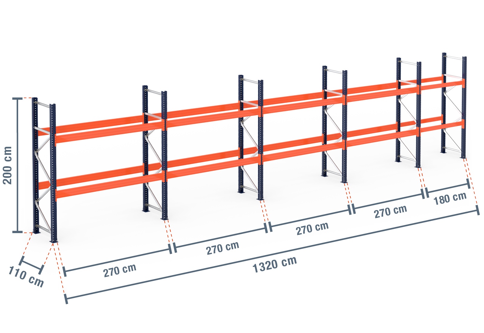 13,2 m rayonnage à palettes PR15000 / profondeur 110 cm / hauteur 2 m / 2 niveaux pour 42 palettes europe