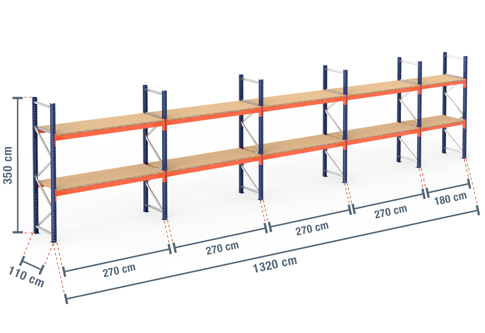 13,2 m rayonnage à palettes PR4500 / profondeur 110 cm / hauteur 3,5 m / 2 niveaux / platelage Bois
