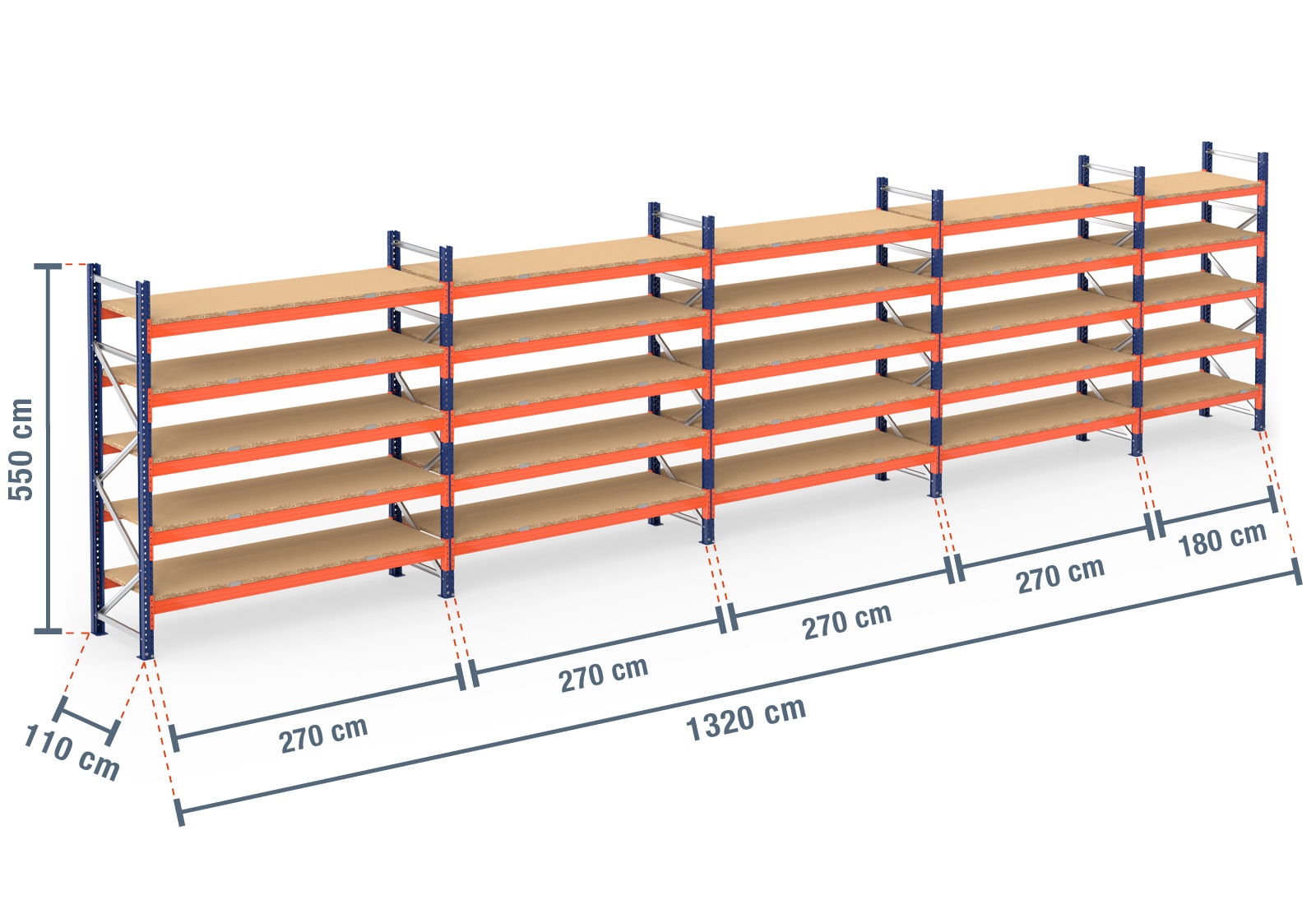 13,2 m rayonnage à palettes PR9000 / profondeur 110 cm / hauteur 5,5 m / 5 niveaux / platelage Bois