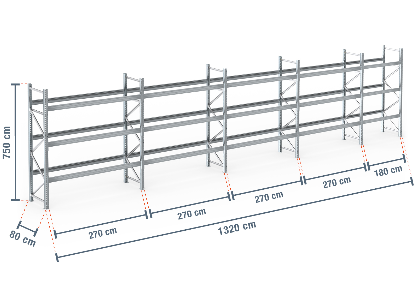 13,2 m rayonnage à palettes PR9000F galvanisé / profondeur 80 cm / hauteur 7,5 m / 3 niveaux pour 56 palettes europe