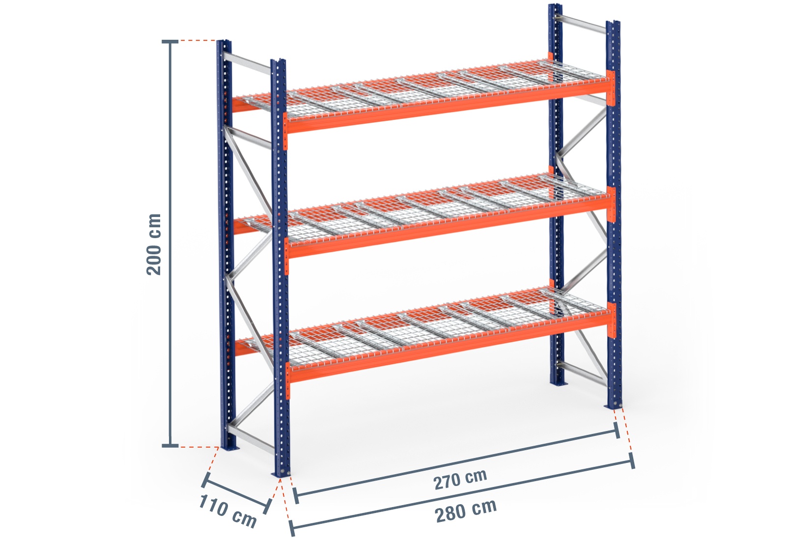 2,8 m rayonnage à palettes PR9000 / profondeur 110 cm / hauteur 2 m / 3 niveaux / platelage Treillis métallique