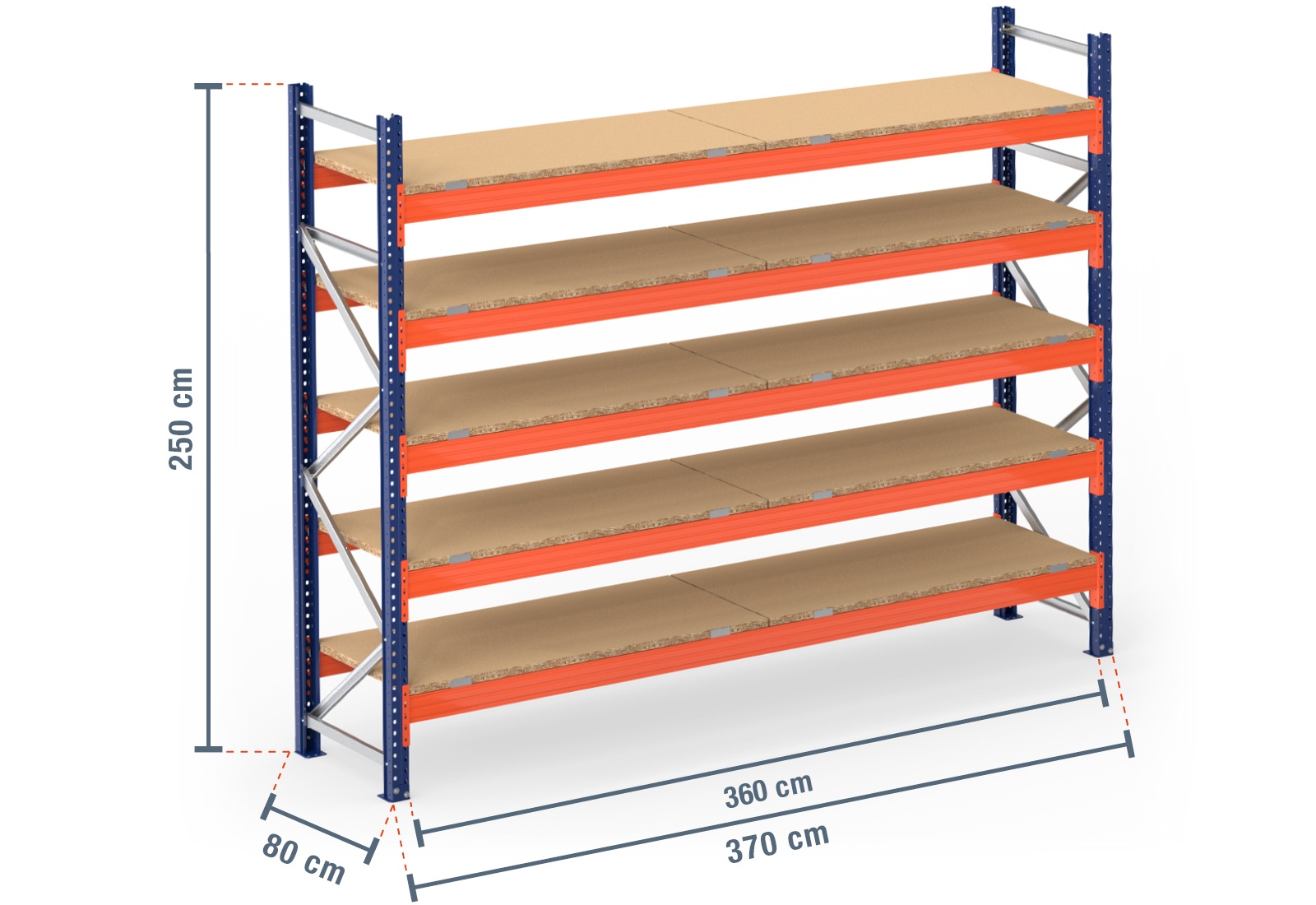 3,7 m rayonnage à palettes PR4500 / profondeur 80 cm / hauteur 2,5 m / 5 niveaux / platelage Bois