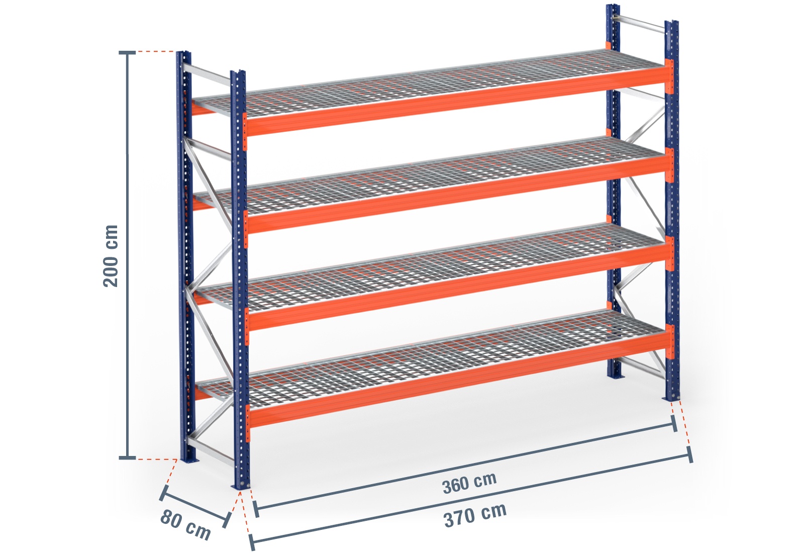 3,7 m rayonnage à palettes PR9000 / profondeur 80 cm / hauteur 2 m / 4 niveaux / platelage Grillage