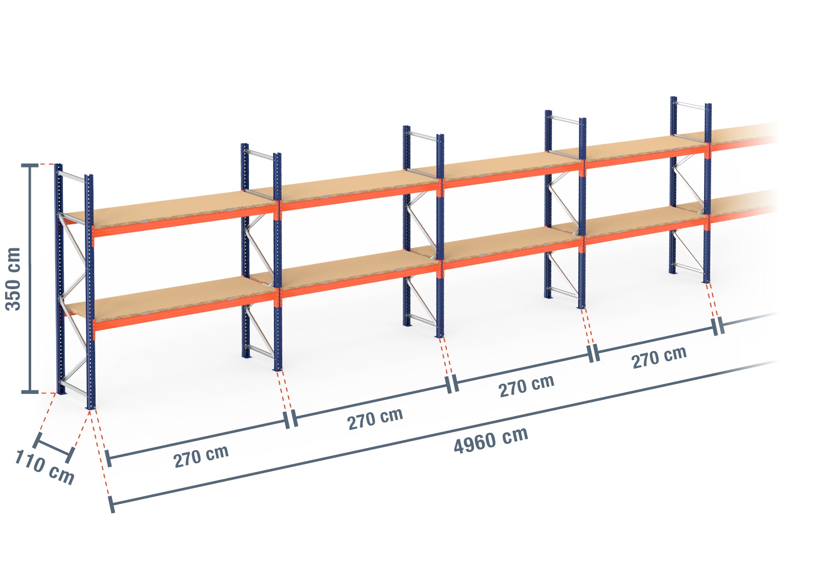 49,6 m rayonnage à palettes PR4500 / profondeur 110 cm / hauteur 3,5 m / 2 niveaux / platelage Bois