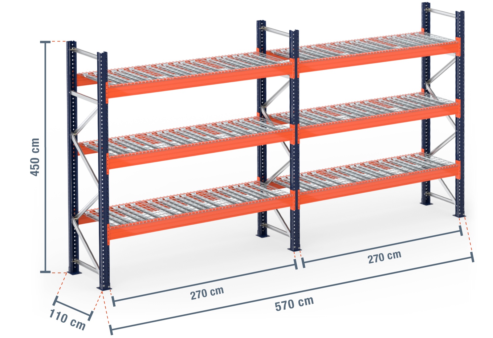 5,7 m rayonnage à palettes PR15000 / profondeur 110 cm / hauteur 4,5 m / 3 niveaux / platelage Treillis métallique