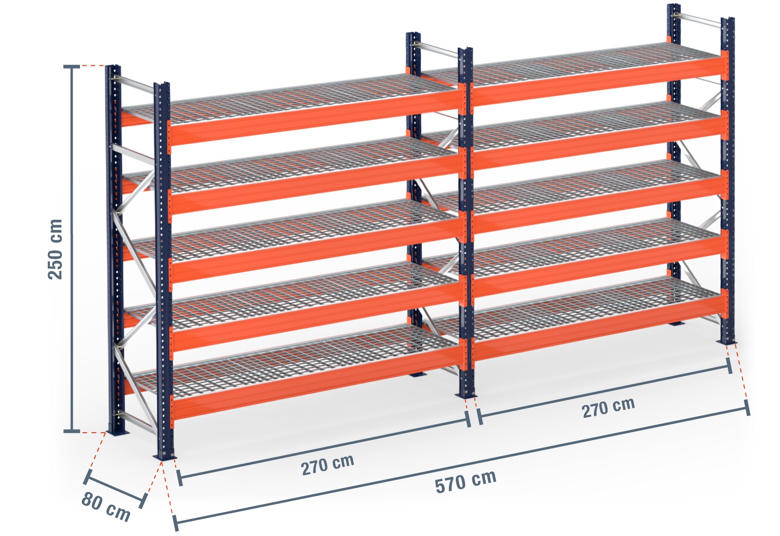 5,7 m rayonnage à palettes PR15000 / profondeur 80 cm / hauteur 2,5 m / 5 niveaux / platelage Grillage