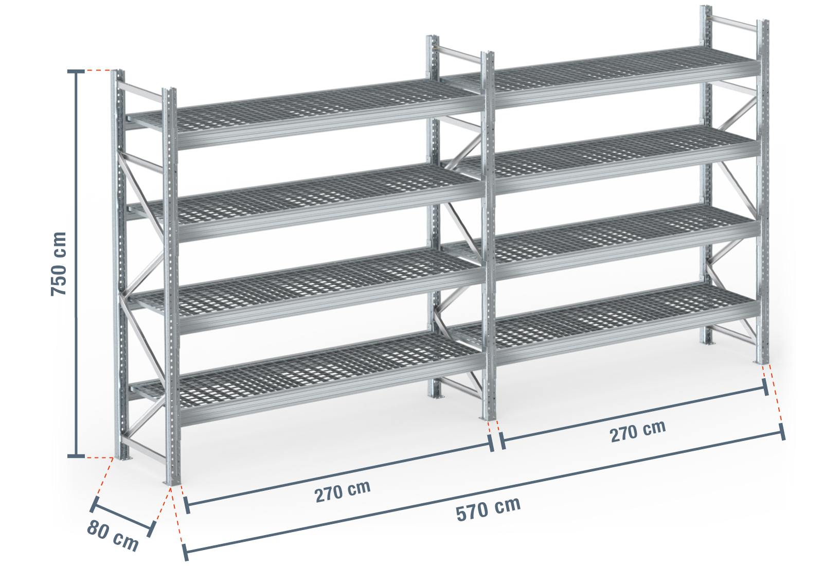 5,7 m rayonnage à palettes PR9000F galvanisé / profondeur 80 cm / hauteur 7,5 m / 4 niveaux / platelage Grillage