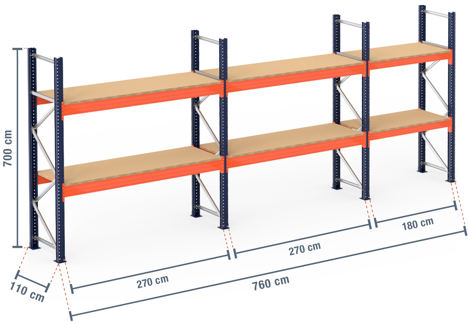 7,6 m rayonnage à palettes PR15000 / profondeur 110 cm / hauteur 7 m / 2 niveaux / platelage Bois