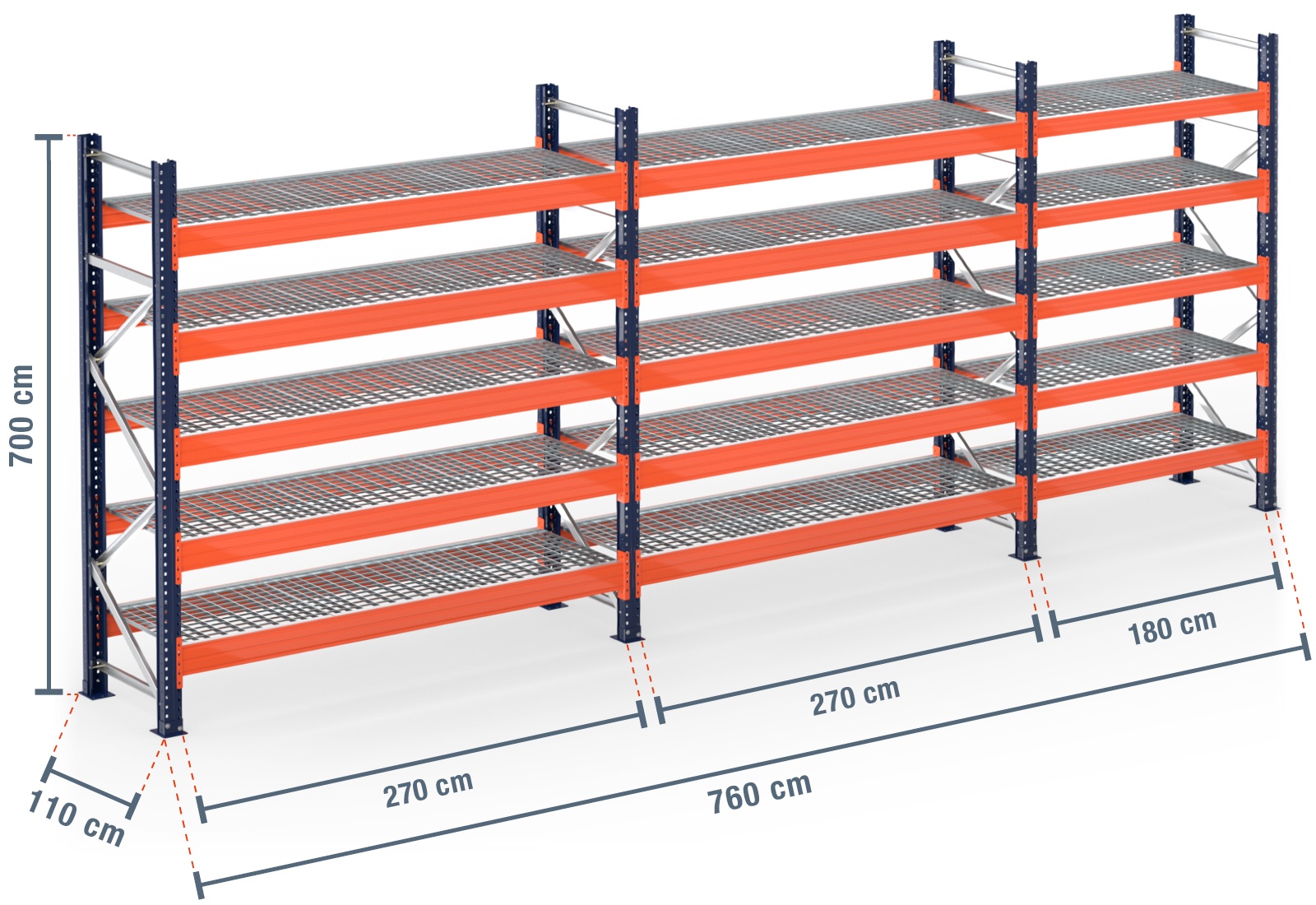 7,6 m rayonnage à palettes PR15000 / profondeur 110 cm / hauteur 7 m / 5 niveaux / platelage Grillage
