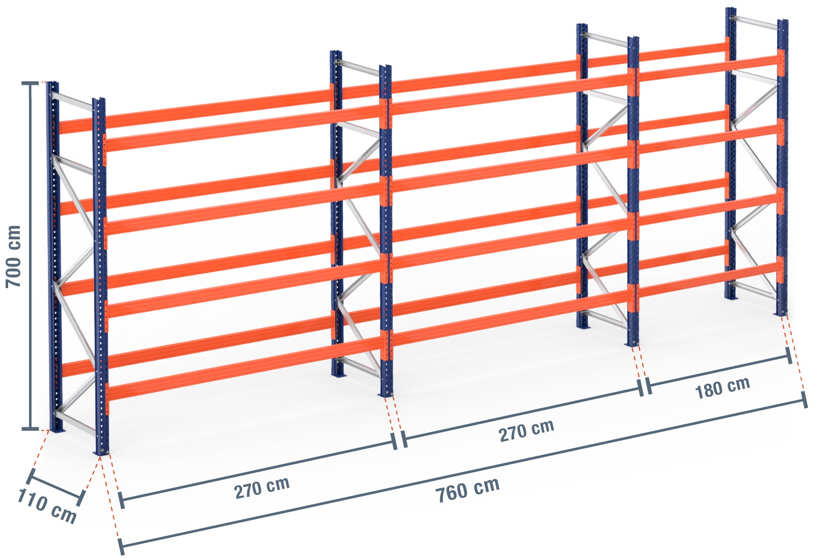7,6 m rayonnage à palettes PR4500 / profondeur 110 cm / hauteur 7 m / 4 niveaux pour 40 palettes europe