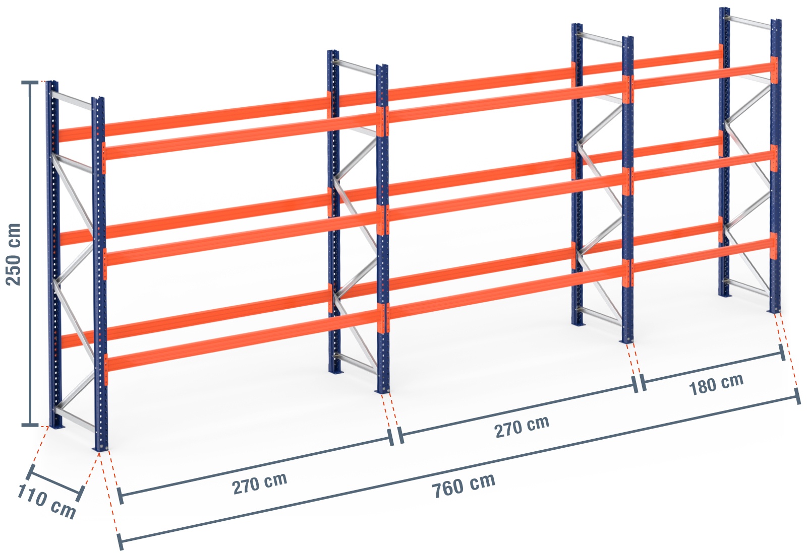 7,6 m rayonnage à palettes PR9000 / profondeur 110 cm / hauteur 2,5 m / 3 niveaux pour 32 palettes europe