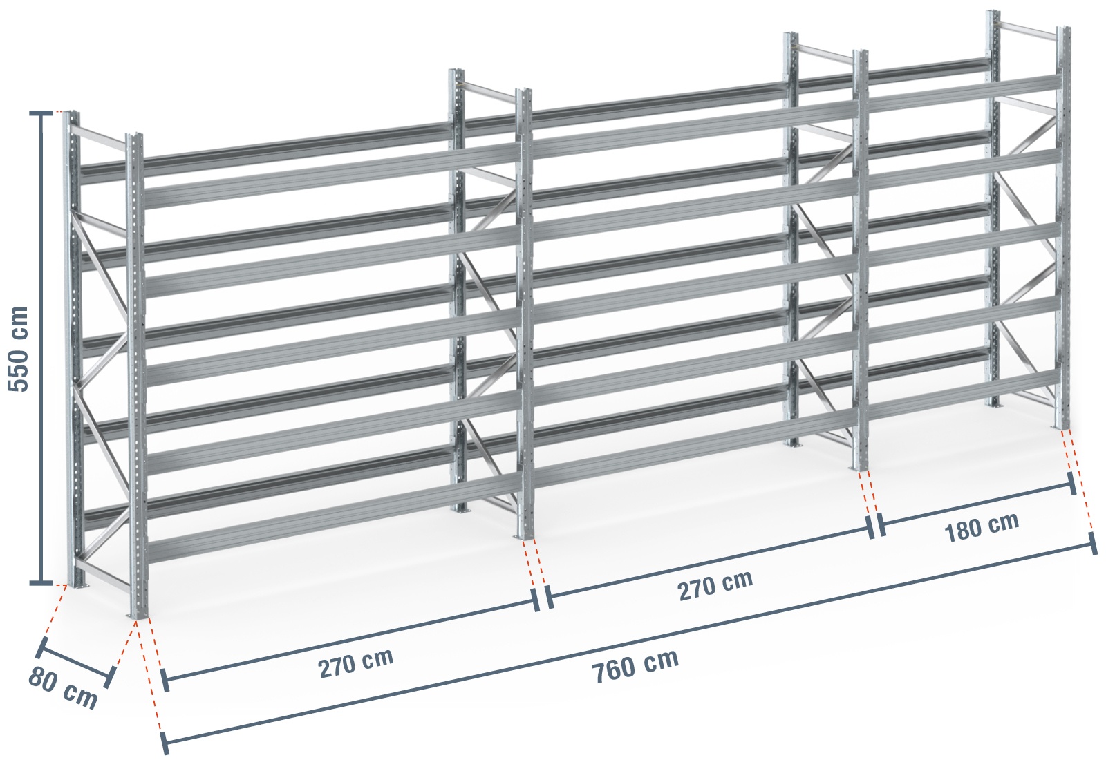 7,6 m rayonnage à palettes PR9000F galvanisé / profondeur 80 cm / hauteur 5,5 m / 5 niveaux pour 48 palettes europe