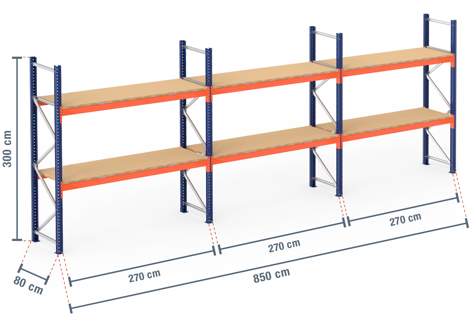 8,5 m rayonnage à palettes PR4500 / profondeur 80 cm / hauteur 3 m / 2 niveaux / platelage Bois