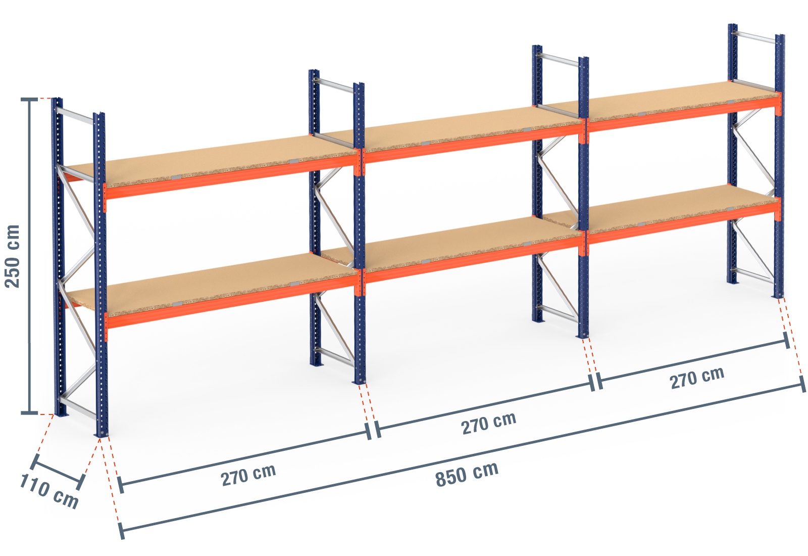 8,5 m rayonnage à palettes PR9000 / profondeur 110 cm / hauteur 2,5 m / 2 niveaux / platelage Bois