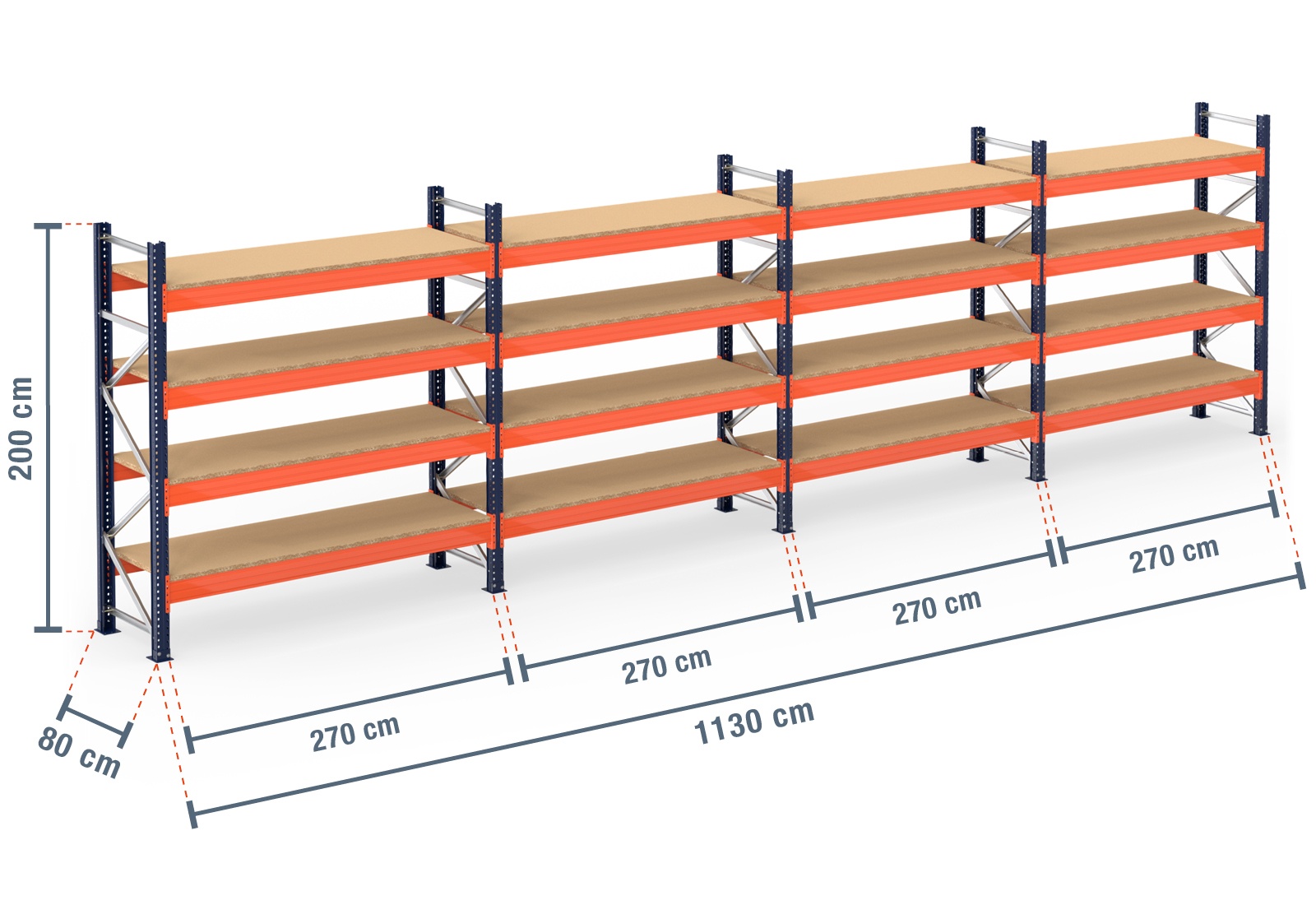 11,3 m rayonnage à palettes PR15000 / profondeur 80 cm / hauteur 2 m / 4 niveaux / platelage Bois