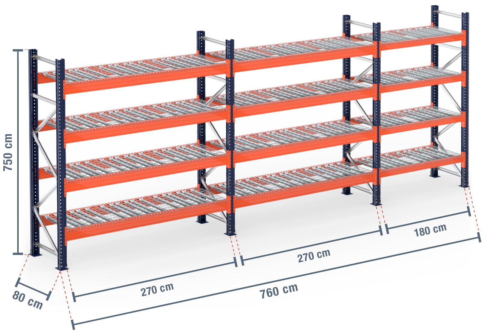 7,6 m rayonnage à palettes PR15000 / profondeur 80 cm / hauteur 7,5 m / 4 niveaux / platelage Treillis métallique