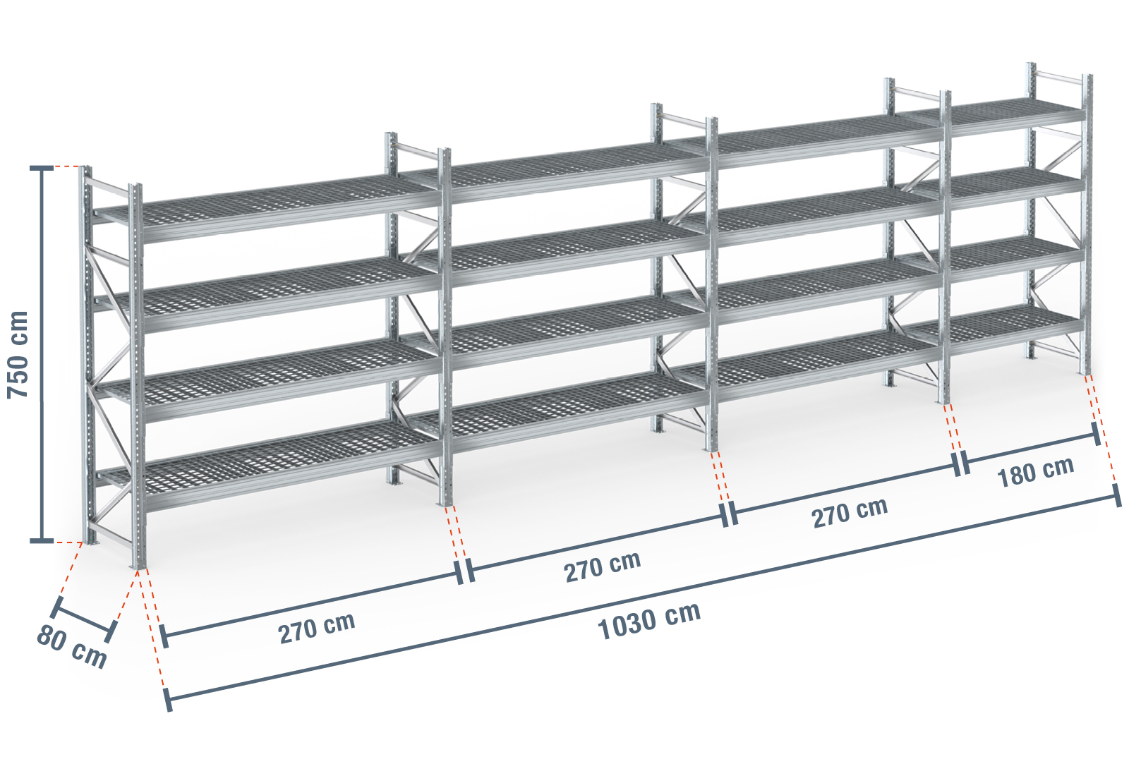 10,3 m rayonnage à palettes PR9000F galvanisé / profondeur 80 cm / hauteur 7,5 m / 4 niveaux / platelage Grillage