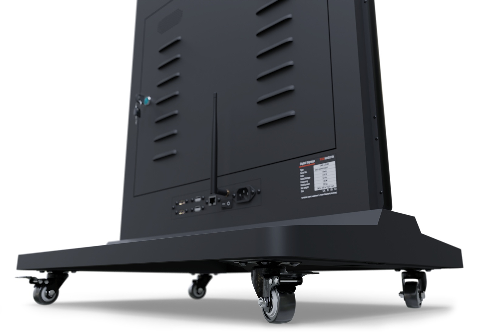 Le stop-client est disponible dans un design simple Noir et s'intègre ainsi à tous les intérieurs. Grâce à ses 4 roulettes (2 roulettes pivotantes et 2 roulettes fixes), le DKS-LED43 est très facile à transporter. Les roulettes doivent être dévissées avant d'emballer le produit dans la caisse de transport.